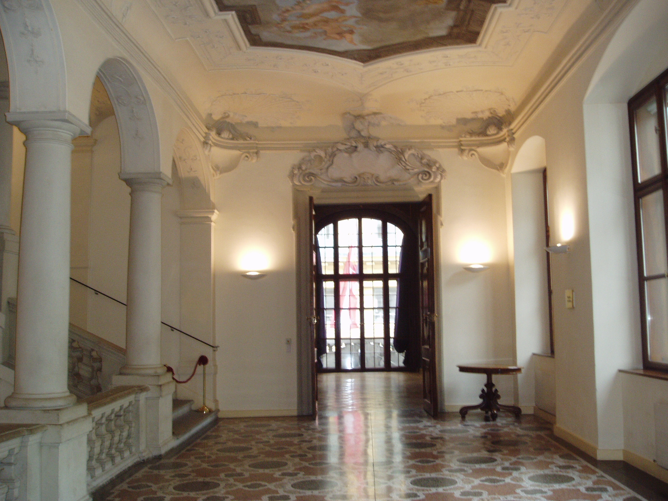 Nyilvános 1632 | 3698 | Augustinerstrasse 2. Lobkowicz-palota | Eredetileg a Dietrichstein grófok számára épült 1685-87 között barokk stílusban, az olasz Giovanni Pietro Tencala építőmester tervei szerint. A Lobkowitz hercegek kívánságára a főhomlokzatot Johann Bernard Fischer von Erlach alakította át 1709-11 között. A palota dísztermét Eroica-teremnek is nevezik, mert 1805. január 3-án Beethoven itt mutatta be III. (Eroica) szimfóniáját. E palotához fűződik az az anekdota, hogy – ugyancsak 1805-ben – Fidelio című operája első változata körüli vitában Beethoven feldühödve hagyta ott a tiszteletére összegyűlt főúri társaságot, s még visszakiabált az utcáról: „Lobkowitz szamár!” Ám a kapcsolatnak ez a dühkitörés nem vetett véget, a zenekedvelő, saját szimfonikus zenekarral rendelkező herceg továbbra is Beethoven mecénása maradt. 1807-ben ugyanitt rendezték meg Beethoven IV. szimfóniájának az ősbemutatóját is. A képen az Eroica-terem bejárata előtti előcsarnok látható, a szemben levő ajtó vezet a terembe (a freskókkal ékesített zeneteremben nem lehet fényképezni). Ebben a palotában tekinthető meg az Osztrák Színháztörténeti Múzeum gyűjteménye is. |