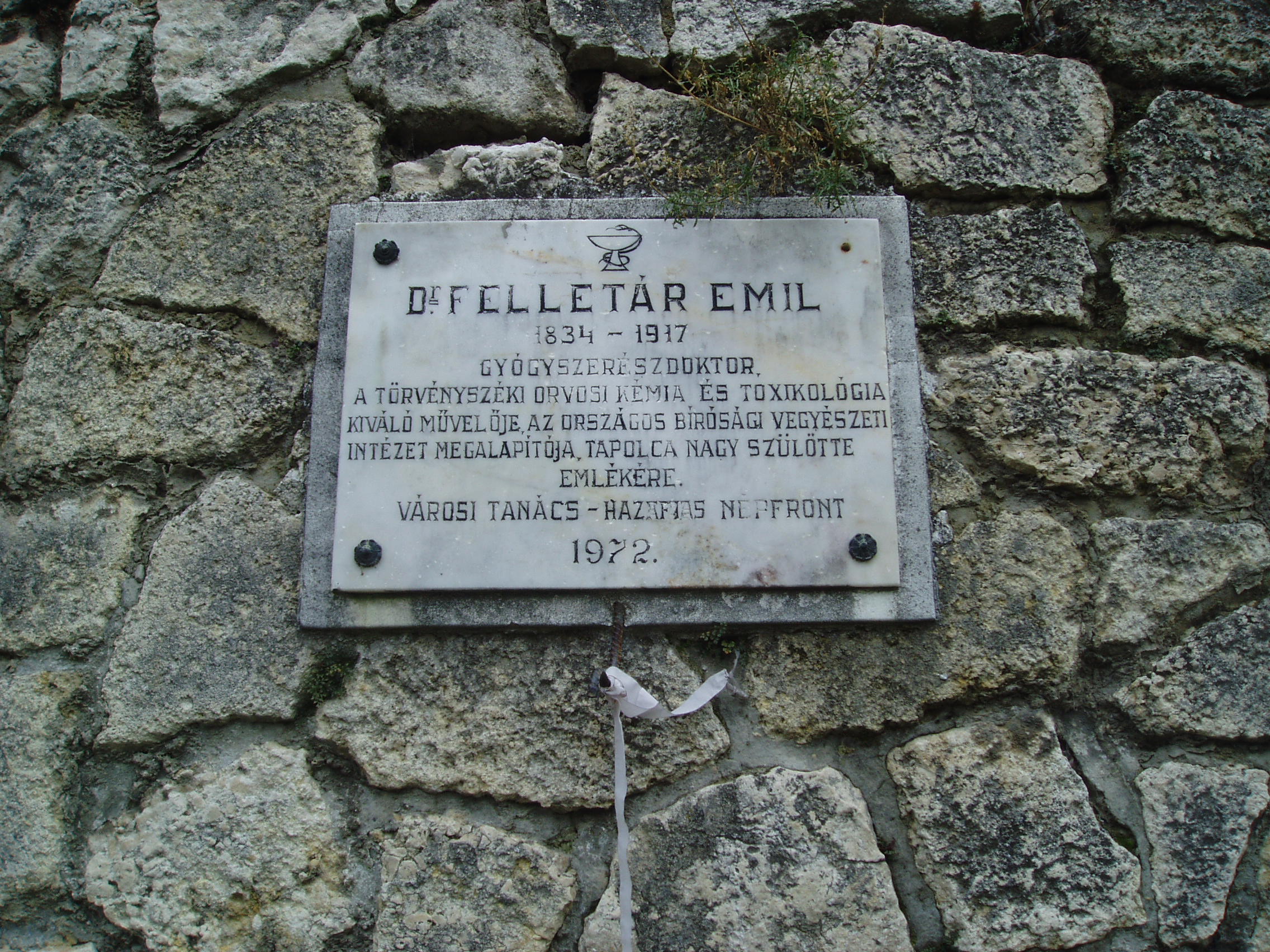 Nyilvános 852 | 1571 | Tapolca, Városi Panteonfal: Felletár Emil emléktáblája | A Malom–tó mögött álló magas kőfal a Városi Panteonfal, amelyen több neves, tapolcai kötődésű személyiségnek állítottak emléktáblát. Dr. Felletár Emil (1834-1917) gyógyszerész-doktor, a törvényszéki orvosi kémia és toxikológia kiváló művelője tapolcai születésű volt. Emléktábláját 1972-ben avatták fel. A felvétel 2007 februárjában készült. Felh. irod.: Bándi László: Emlékhelyek Veszprém megyében. Veszprém, 1996 www.tapolca.hu |