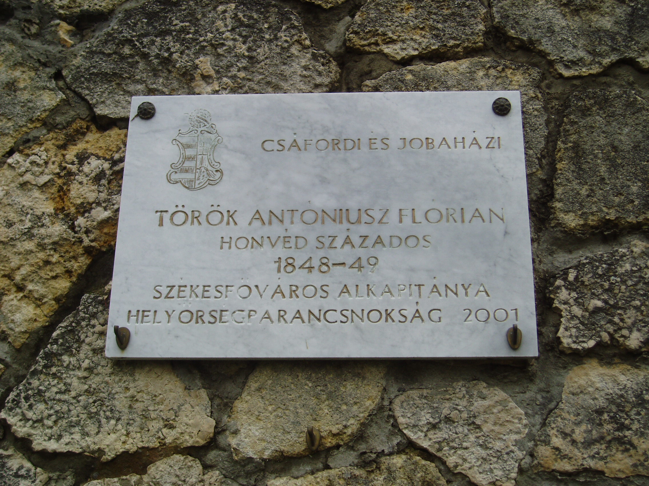 Nyilvános 854 | 1536 | Tapolca, Városi Panteonfal: Török Antóniusz Flórián emléktáblája | A Malom–tó mögött álló magas kőfal a Városi Panteonfal, amelyen több neves, tapolcai kötődésű személyiségnek állítottak emléktáblát. Török Antóniusz Flórián (1825-1878) 1848/49-ben honvéd százados volt. 2001-ben felavatott emléktáblája a testvére, Török János emlékét őrző tábla mellett látható. A felvétel 2007 februárjában készült. Felh. irod.: Bándi László: Emlékhelyek Veszprém megyében. Veszprém, 1996 www.tapolca.hu |