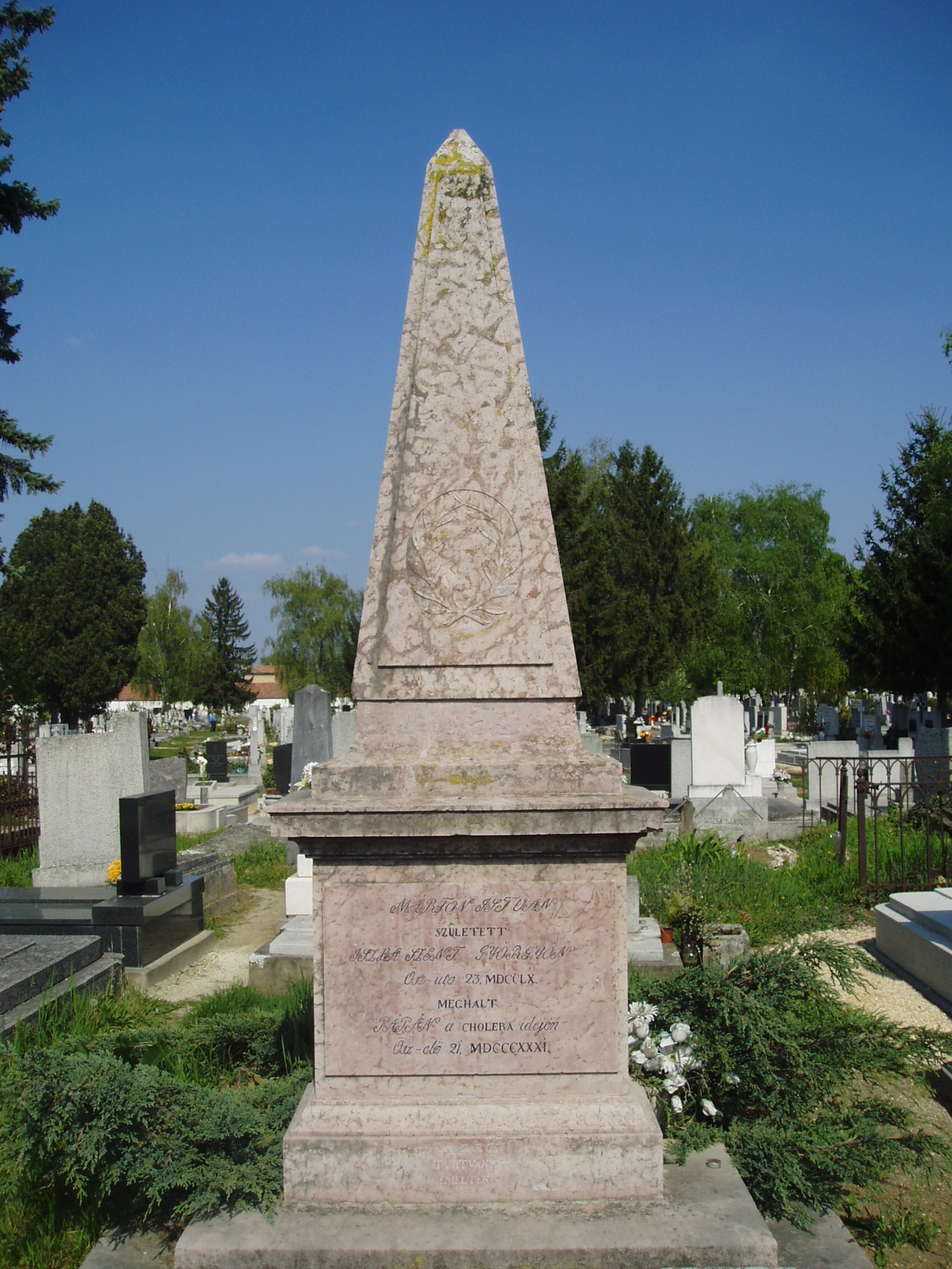 Nyilvános 1095 | 3560 | Pápa, Alsóvárosi temető: Mándi Márton István sírja | A Jókai utcáról nyíló Temető utca vezet a XIX. század elején megnyílt Alsóvárosi köztemetőbe. A város sok neves személyiségének van itt a sírja. Itt nyugszik Mándi Márton (Iszkaszentgyörgy, 1760. nov. 23. – Pápa, 1831. szept. 21.) nyelvész, tanár, filozófus. Kecskeméten, Debrecenben, majd Göttingában tanult. 1790-től volt a pápai református gimnázium rektor-professzora. Nevéhez fűződik az iskola új fellendülése. A filozófiában Kant követője volt és 1795-ben már Kant tanítása alapján tartott előadásokat, amelyekért súlyos bírálat érte. Márvány mellszobra, Izsó Miklós alkotása a református könyvtárban látható (Pápa, Március 15. tér 9.). A városban utcanév, az Ókollégium (Petőfi S. utca 13.) falán tábla őrzi emlékét. A fénykép 2007 áprilisában készült. Felh. irod.: Németh Adél - Szabó Lajos: Pápa. Bp. Panoráma, 1989 Veszprém megyei életrajzi lexikon. Veszprém, Veszprém Megyei Önkormányzat Közgyűlése, 1998 |