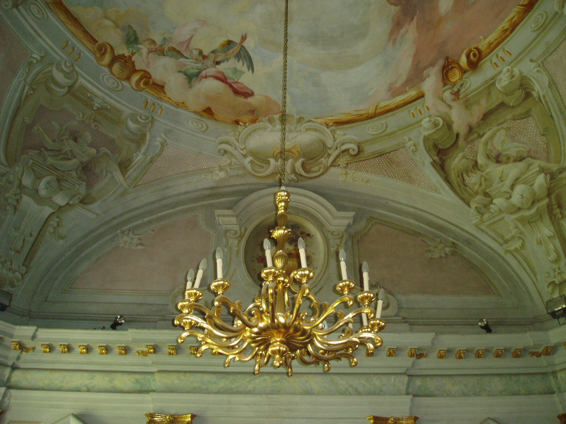 Nyilvános 890 | 2503 | Pápa, Fő tér 1-3. Esterházy-kastély | A barokk kastély a korábban itt állott végvár helyére épült, részben annak alapfalai, kövei felhasználásával. A régi várat az 1740-es évektől Esterházy Ferenc (1683–1754) tárnokmester kezdte átalakítani Franz Anton Pilgram tervei alapján. A barokk várkastély kialakítása 1784-re fejeződött be Esterházy Ferenc fia, Eszterházy Károly egri püspök idejében Fellner Jakab, majd Grossmann József vezetésével. Az U alakú, egyemeletes épület a versailles-i palota nyomán elterjedt francia kastélytípus képviselője. Az épület keleti szárnyának emeletén volt a kastély kápolnája. Az 1988/89-ben végzett restaurálás eredményeképpen ma újra megcsodálható a helyiség eredeti architektúrája és Joseph Ignaz Mildorfer 1750 körül festett mennyezetképe, amely Krisztus mennybemenetelét ábrázolja. A kápolnában, amelynek példaszerű felújításáért a város 1990-ben Europa Nostra díjat kapott, ma a Jókai Mór Városi Könyvtár olvasóterme működik. A fénykép 2007 áprilisában készült. Felh. irod.: Németh Adél - Szabó Lajos: Pápa. Bp. Panoráma, 1989 Pápa. Szerk. Sz. Farkas Aranka. Bp., Magyar Képek, 2000 |