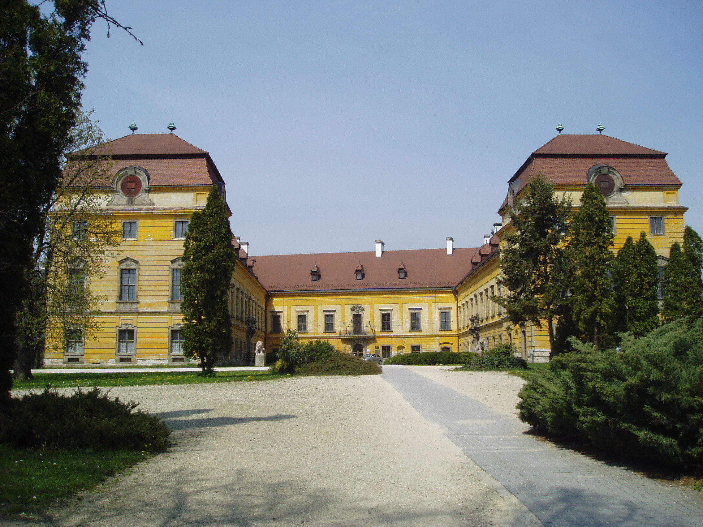Nyilvános 909 | 1718 | Pápa, Fő tér 1-3. Esterházy-kastély | A barokk kastély a korábban itt állott végvár helyére épült, részben annak alapfalai, kövei felhasználásával. A régi várat az 1740-es évektől Esterházy Ferenc (1683–1754) tárnokmester kezdte átalakítani Franz Anton Pilgram tervei alapján. A barokk várkastély kialakítása 1784-re fejeződött be Esterházy Ferenc fia, Eszterházy Károly egri püspök idejében Fellner Jakab, majd Grossmann József vezetésével. Az U alakú, egyemeletes épület a versailles-i palota nyomán elterjedt francia kastélytípus képviselője. A kastély dísztermei jelenleg (2007) - az egykori kápolna kivételével - nem látogathatók. Valaha az épület nyugati szárnyának végén volt a híres Esterházy-levéltár. Középkori anyagát XIV-XV. századi oklevelek - köztük a Pápa család okiratai - képezték. Az újkori rész a Zápolyák, az enyingi Török, a devecseri Choron és az Esterházy család oklevélanyagát tartalmazta. Ez a felbecsülhetetlen értékű okmánytár a második világháborúban megsemmisült. Az Esterházy–kastély ma a Jókai Mór Városi Könyvtár és a Jókai Mór Művelődési Központ otthona. A példaszerűen felújított kastélykápolnában a könyvtár olvasóterme működik. A fénykép 2007 áprilisában készült. Felh. irod.: Németh Adél - Szabó Lajos: Pápa. Bp. Panoráma, 1989 Pápa. Szerk. Sz. Farkas Aranka. Bp., Magyar Képek, 2000 |