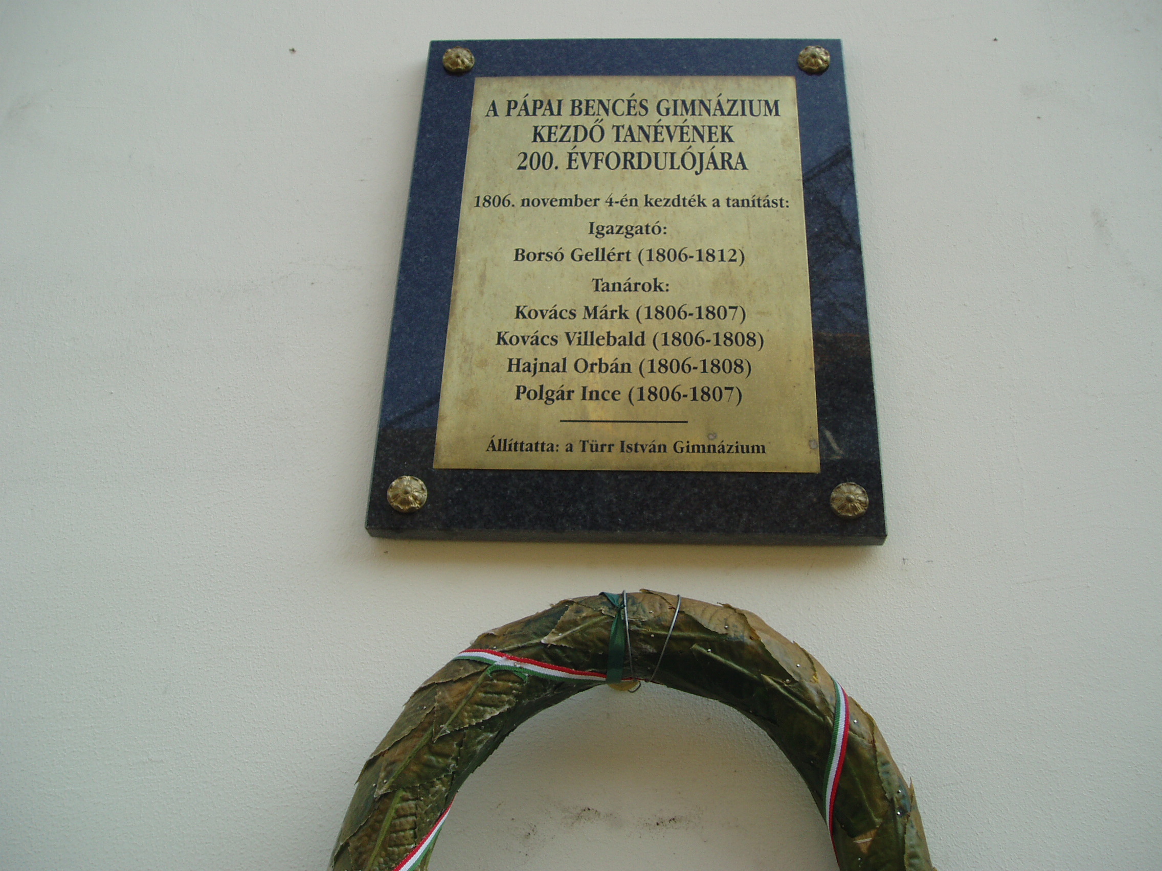 Nyilvános 854 | 1396 | Pápa, Fő utca 10. Bencés templom | Eredetileg a pálosok számára épült 1737-1742 között a korábban itt állott templom helyére. Építtetője, Acsády Ádám püspök szentelte fel. A pálos rend eltörlése után, 1806-ban kapták meg a bencések, akik ugyanebben az évben átvették és rendkívül magas szintre fejlesztették a pálosok korábbi iskoláját. A képen a bencés gimnázium 200. évfordulója alkalmából elhelyezett emléktábla látható az első tanári kar névsorával. A fénykép 2007 áprilisában készült. Felh. irod.: Németh Adél - Szabó Lajos: Pápa. Bp. Panoráma, 1989 |