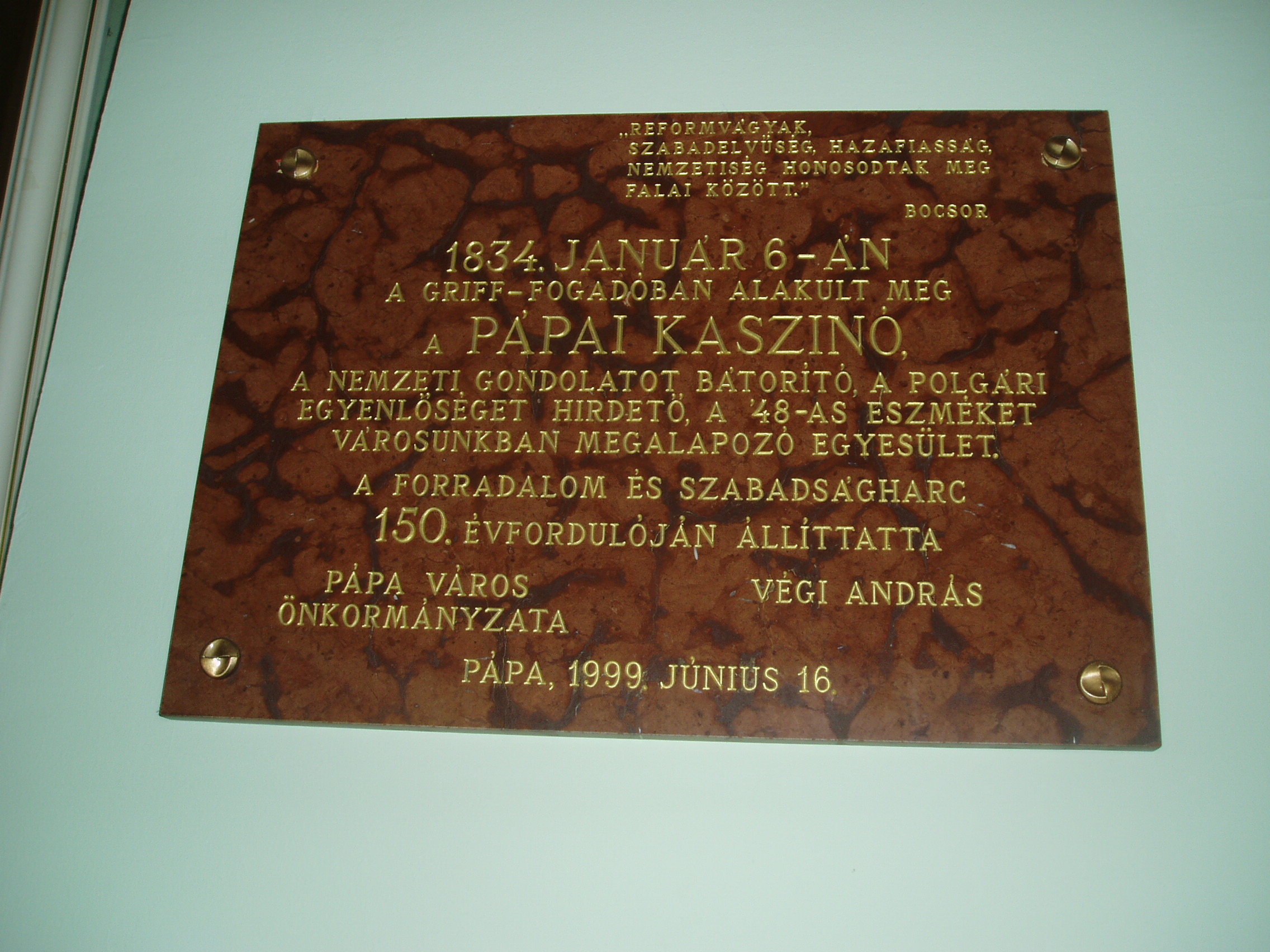 Nyilvános 890 | 1505 | Pápa, Fő utca 15. Griff Szálló - a Kaszinó megalakulásának emléktáblája | A Fő tér és a Fő utca sarkán áll a Griff Szálló copf stílusú, 1780–1790 között emelt, 1870 körül némileg átalakított épületegyüttese. Nevét az Esterházy család címerállatáról kapta. A Fő utca felőli oldalt Kapuszínnek is nevezik, ugyanis az emelet alatti részen nyílik Pápa sétálóutcájának, a Kossuth utcának a bejárata. A ház másik része a szálloda. A XIX. század folyamán a Griff volt a pápai társas élet központja. Itt alakult meg 1834-ben, Széchenyi István kezdeményezése nyomán — az országban az elsők között — a pápai kaszinó. E jeles eseménynek 1999-ben felavatott vörös márványtábla állít emléket. A Griff ma is meglévő patinás tánctermében — az ún. Tükörteremben — egykor színielőadások és megyebálok zajlottak. Testőrtiszt korában táncolt itt leendő feleségével, Szegedy Rózával Kisfaludy Sándor. Jónéhány évtizeddel később Mikszáth Kálmán volt jelen egy itt tartott táncmulatságon, s ez az élmény inspirálta A Noszty fiú esete Tóth Marival című regényének báli jelenetét. A XIX. század legelejétől 1881-ig, a pápai kőszínház (lásd: Pápa, Március 15. tér) megépítéséig a városba érkező különböző színtársulatok — kevés kivétellel — a Griff nagytermében tartották előadásaikat. A magyar színjátszás nagy egyéniségei közül játszott itt Déryné és Kántorné is. 1842-ben a színielőadások rendszeres látogatója volt két pápai diák, akik maguk is színészi–művészi vágyakat melengettek szívükben: Petőfi Sándor és Jókai Mór (akkor még Petrovics Sándor és Jókay Móric). Petőfi már itt tapsolhatott későbbi jóbarátjának, Egressy Gábornak, aki nevezetes szerepeiben lépett fel a társulat vendégeként — többek között Hamletet és Lear királyt játszotta. A társulat vezető színésznője Szatmáryné Farkas Lujza volt, aki elbűvölte a kamasz Petőfit. Petőfi és Jókai tiszteletüket kívánták tenni a művésznőnél, akit azonban éppen egy társnőjével civakodva találtak a Griff folyosóján. Petőfi — kiábrándulva — ekkor írta meg Szín és való című költeményét, amellyel aztán két arany pályadíjat nyert. A teremben sok jeles hangversenyt is rendeztek. 1937-ben fellépett itt Bartók Béla is fiatal kamarapartnerével, Gertler Endre hegedűművésszel. E nevezetes koncert 60. évfordulóján, 1997-ben emlékhangversenyt rendeztek ugyanitt, melyen részt vett az akkor már 90 esztendős Gertler Endre is. Mindkét eseményről vörös márványtábla emlékezik meg a Tükörteremben. Felh. irod.: Pápa. Szerk. Sz. Farkas Aranka. Bp., Magyar Képek, 2000. Németh Adél – Szabó Lajos: Pápa. Bp. Panoráma, 1989 Nádasdy Lajos: A pápai kőszínház története 1817–1931. Veszprém, 1981, Veszprém megyei Tanács www.kincsestar.radio.hu/harangok "A kényes úrfi s a rongyos baka". Tanulmányok két halhatatlan pápai diákról. Pápa, Pápai Református Gyűjtemények, 2001 |