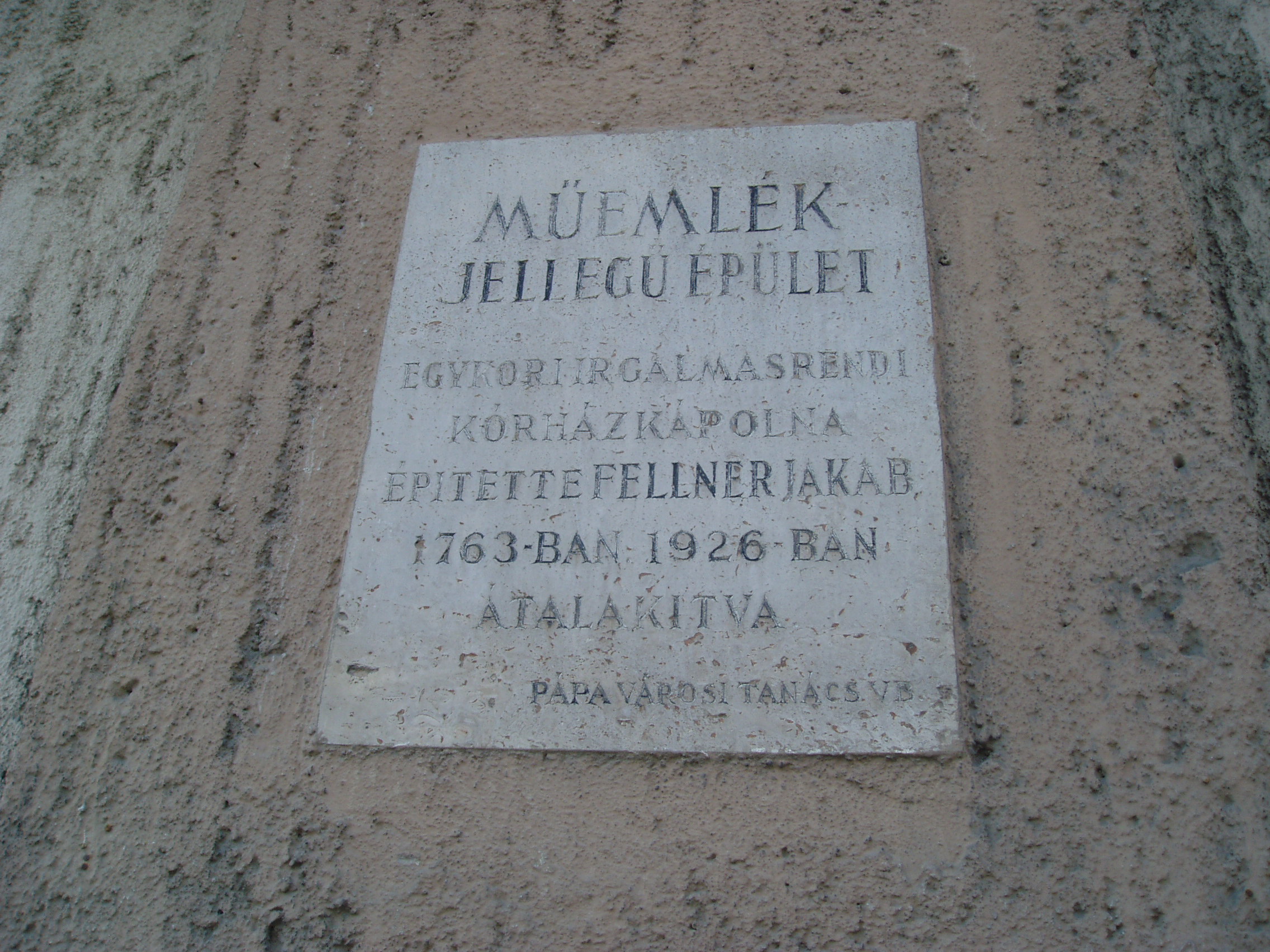 Nyilvános 832 | 1411 | Pápa, Jókai utca 7. | A kórház régi épülete 1763-1768 között készült el Fellner Jakab tervei alapján. Az irgalmas rendet 1730 körül gróf Esterházy Ferenc telepítette le Pápán az akkor gyakori pestises betegek ápolására. Első kórházuk is ezen a helyen volt, melynek céljára a Zöldfa vendéglőt alakították át. A mai kórházat 1757-ben alapította Eszterházy Károly, Pápa ura, akkor váci, majd egri püspök (lásd még: Pápa, Jókai u. 9.). A Fellner Jakab által épített, azóta kibővített és átalakított épület egyemeletes, szárnyai négyszögű udvart vesznek körül. A ma is látható torony az egykori kórházkápolnához tartozott. A képen az erre vonatkozó műemléki tábla látható. A fénykép 2007 áprilisában készült. Felh. irod.: Németh Adél - Szabó Lajos: Pápa. Bp. Panoráma, 1989 |