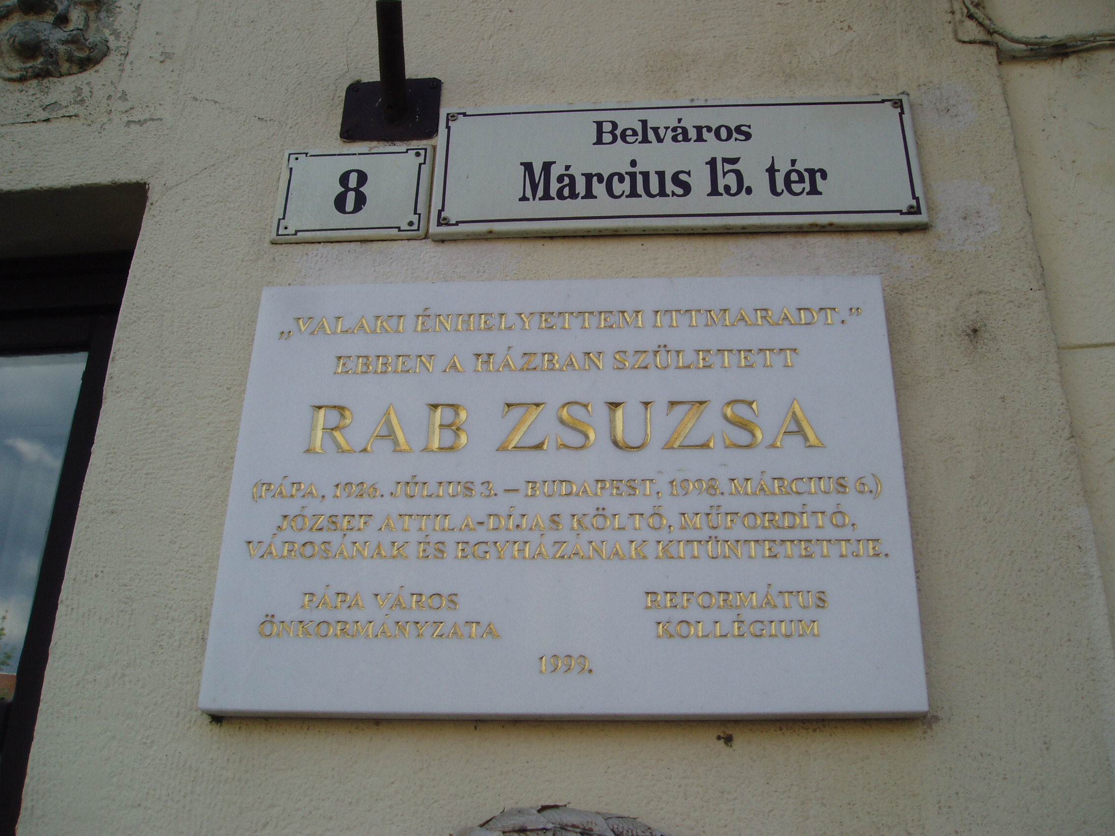 Nyilvános 855 | 1458 | Pápa, Március 15. tér 8. | Az emeletes saroklakóház 1870 körül épült. Ebben a házban született 1923. július 3-án Rab Zsuzsa költő, műfordító. Édesapja, Rab István 1886-1957) a második világháborút megelőző időszakban a Pápai Református Kollégium Gimnáziumának (lásd: Pápa, Március 15. tér 9.) legendás hírű igazgatója, édesanyja a pápai templomépítő–gondnok, Jilek Ferenc lánya. Tanulmányait szülővárosában kezdte, majd 1944–ben a Kecskeméti Református Nőnevelő Intézetben érettségizett. A budapesti egyetem orvostudományi szakára iratkozott be, majd egy év elteltével a bölcsészkar orosz szakos hallgatója lett. A nyelvek, az irodalmak szépségével édesapja ismertette meg. Bizonyára nagy része volt abban, hogy a fiatal kamaszlány 16 éves korában saját verseskötetben tárta fel diáktársainak a szerelemről, otthonról, költészetről fogant lírai impresszióit. A fény felé című kötetet 17 évig nem követhette másik. A második világháború után megváltozott rendszerben Rab Zsuzsa egyetemi tanulmányaihoz állami támogatást nem kaphatott. Édesapját nyugdíj nélkül bocsájtották el, a családot osztályidegennek nyilvánították. Egyetemistaként takarításból, kisebb diákok tanításából, alkalmi munkákból élt. Tehetségének és kitartó szorgalmának köszönhetően 1955–ben robbanásszerűen tört be a műfordítás–irodalomba a magyar nyelven addig ismeretlen Szergej Jeszenyin verseinek fordításával. Ezután sorra jelentek meg műfordításai. Hihetetlenül gazdag életművet szakított félbe a halál 1998. március 5-én. Rab Zsuzsa szeretett iskolájára hagyta könyvtárának jelentős hányadát (a Petőfi u. 13. számú épületben, az ún. Ókollégiumban található), vagyonának egy részéből pedig létrehozta a Rab István Alapítványt, amellyel a latinban jeleskedő ifjakat kívánta támogatni. A fénykép 2007 áprilisában készült. Felh. irod.: Németh Adél - Szabó Lajos: Pápa. Bp. Panoráma, 1989 Rab Zsuzsa. = Olvadás. A Pápai Református Gimnázium diáklapja. 2003. 8. |