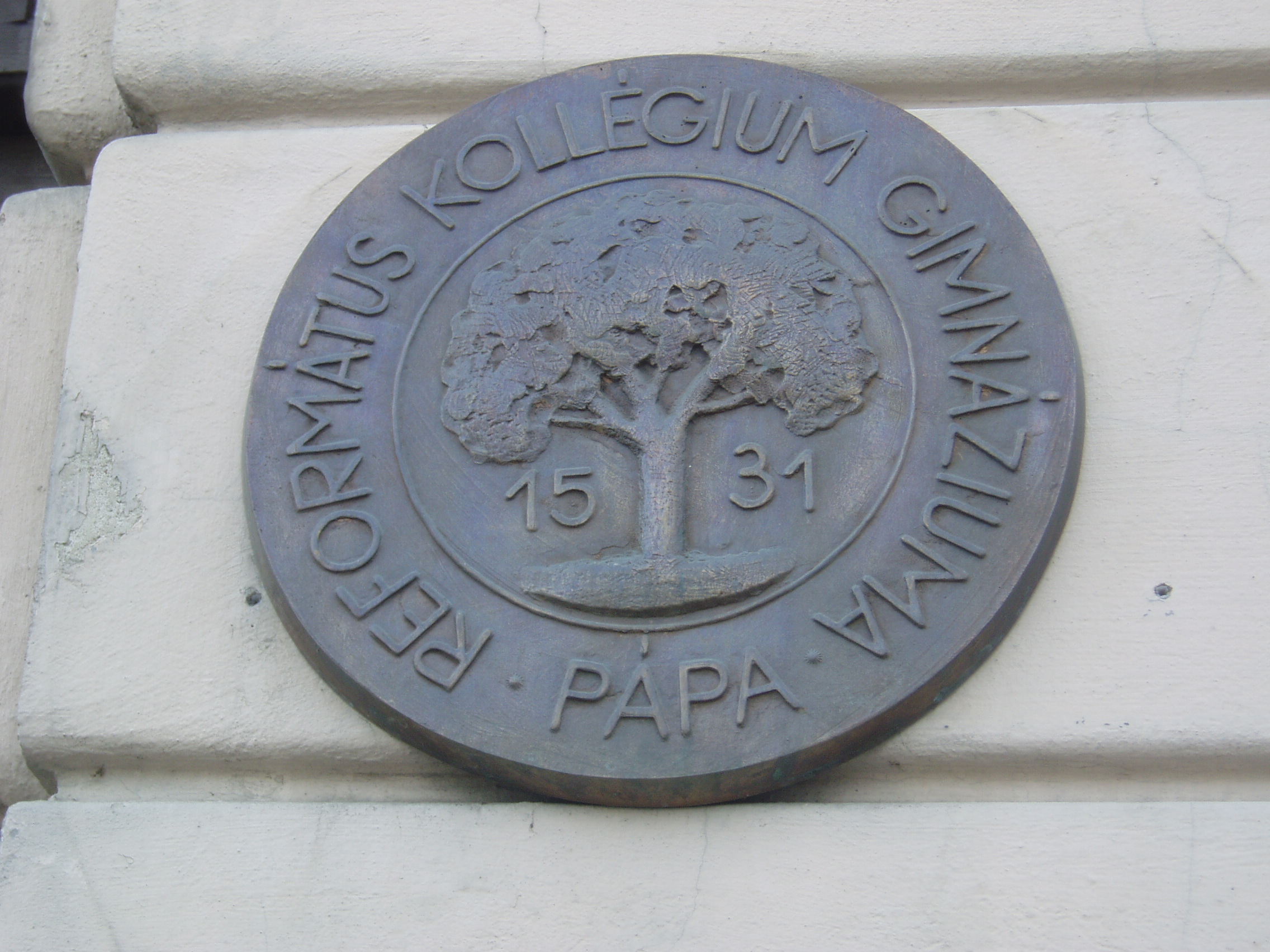 Nyilvános 881 | 1563 | Pápa, Március 15. tér 9. Pápai Református Kollégium Gimnáziuma | A híres pápai Református Kollégium első épülete 1531 és 1752 között a mai Ruszek közben, a Lábasház épületének helyén állott. 1752-ben - Mária Terézia rendeletének következtében, amely megszüntette a szabad vallásgyakorlást - harminckét évig csak a közeli Adásztevelen működhetett. 1784-ben, II. József türelmi rendeletének köszönhetően térhetett vissza az iskola Pápára, s hamarosan felépült a ma Ókollégiumként ismert épület (lásd: Pápa, Petőfi u. 13.), amelyben 1794-ben indulhatott meg az oktatás. Az intézmény 1857-ig működött ott, ekkor átköltözött a Március 15. tér 13-15. számú házba, az ún. Nátus-ba, majd 1895-ben utolsó végleles helyére, ide, a Március 15. tér 9. számú monumentális új épületbe. A főbejárat mellett a Kollégium jelképe, egy eperfa sziluettje látható az alapítás évszámával. A jelkép eredete az adászteveli száműzetés idejére nyúlik vissza: mivel a teveli kicsi iskolában nem fért el a diákság, az órákat kezdetben egy eperfa alatt tartották. Az iskola jeligéjét: "Istennek, hazának, tudománynak" egykori diákja, Jókai Mór fogalmazta meg. A fénykép 2007 áprilisában készült. Felh. irod.: Németh Adél - Szabó Lajos: Pápa. Bp. Panoráma, 1989 http://refi-papa.hu |