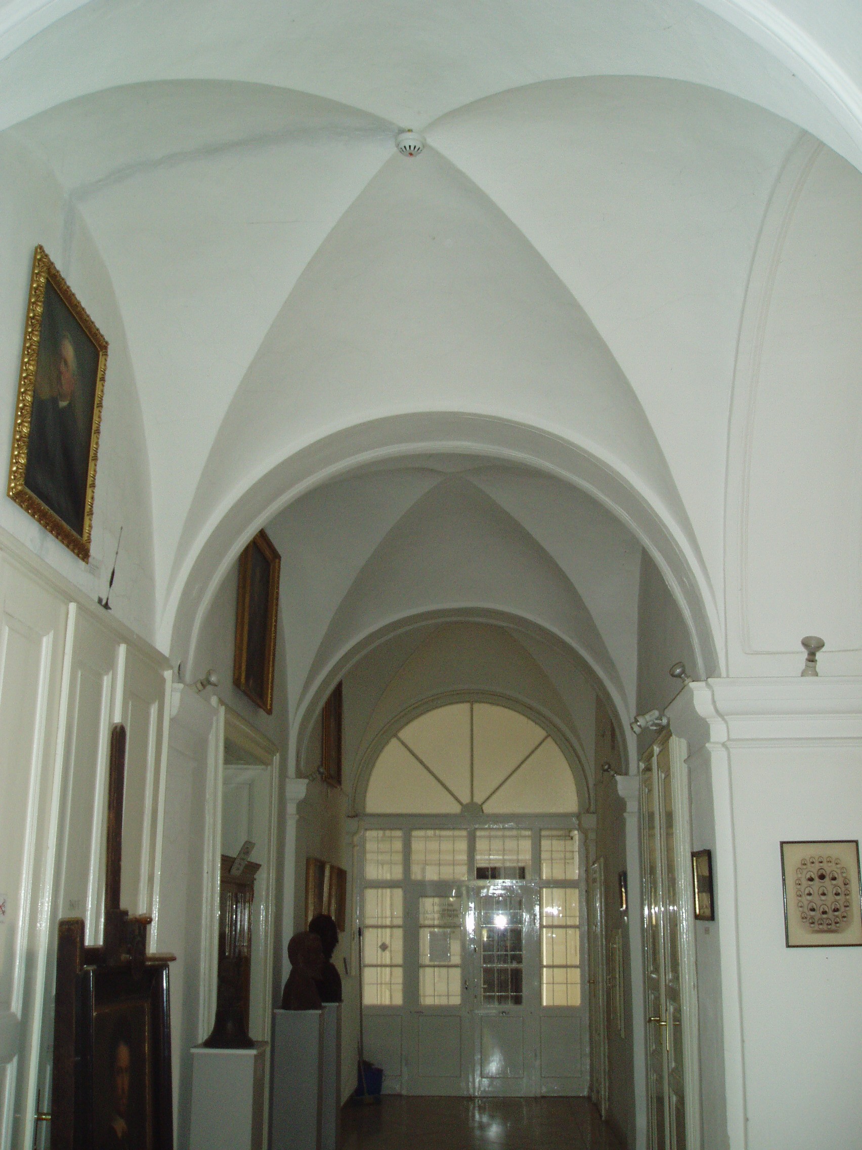 Nyilvános 903 | 1629 | Pápa, Március 15. tér 9. Pápai Református Kollégium Gimnáziuma | A híres pápai Református Kollégium első épülete 1531 és 1752 között a mai Ruszek közben, a Lábasház épületének helyén állott. 1752-ben - Mária Terézia rendeletének következtében, amely megszüntette a szabad vallásgyakorlást - harminckét évig csak a közeli Adásztevelen működhetett. 1784-ben, II. József türelmi rendeletének köszönhetően térhetett vissza az iskola Pápára, s hamarosan felépült a ma Ókollégiumként ismert épület (lásd: Pápa, Petőfi u. 13.), amelyben 1794-ben indulhatott meg az oktatás. Az intézmény 1857-ig működött ott, ekkor átköltözött a Március 15. tér 13-15. számú házba, az ún. Nátus-ba, majd 1895-ben utolsó végleles helyére, ide, a Március 15. tér 9. számú monumentális új épületbe. A képen a könyvtárhoz vezető folyosó látható, ahol tárlókban sok érdekes és értékes könyv, dokumentum, képi ábrázolás látható. Az intézmény könyvtára a Pápai Református Gyűjtemények része (másik két szervezeti egysége a levéltár és az egyházművészeti gyűjtemény). Eredete egybeesik az iskola kezdeteivel, a XVI. század óta létezik. Eleinte főleg adományok útján gyarapodott: a külföldi tanulmányútról hazatért teológusok hoztak állományába értékes könyveket. A tudatos gyarapítás a XVIII. század végétől indult meg. Állományában ritka kincseket is találhatók. Legértékesebb az a XIV. századi kisméretű kódex, amely a német nyelv svájci dialektusában, gót betűkkel írt imádságokat és egyházi naptárt tartalmaz, s ifj. Pázmándy Dénes ajándékaként került a könyvtárba. Figyelemre méltó nyomtatvány a Huszár Dávid által Pápán 1577-ben nyomtatott könyv, a Heidelbergi Káté magyar fordítása. Szintén egyedülálló kötet Bornemisza Péter: Ördögi kisértetekrül című munkája, mely 1578-ban jelent meg. Ebben a formájában ez az egyetlen példány maradt fönn belőle. A fénykép 2007 áprilisában készült. Felh. irod.: Németh Adél - Szabó Lajos: Pápa. Bp. Panoráma, 1989 http://refi-papa.hu www.papacollege.hu |