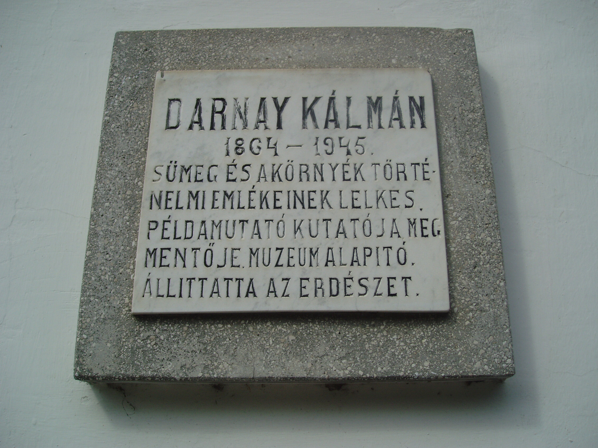 Nyilvános 872 | 1432 | Sümeg, Panteonfal. Darnay Kálmán emléktáblája | A Kisfaludy téren, Kisfaludy Sándor szülőháza előtt alakították ki Sümeg Panteonfalát. A képen Darnay Kálmán emléktáblája látható (1955). Felirata: DARNAY KÁLMÁN 1864-1945 Sümeg és a környék történelmi emlékeinek lelkes, példamutató kutatója, megmentője, múzeumalapító. Állíttatta az Erdészet Darnay Kálmán (Sümeg, 1864. máj. 11. – Sümeg, 1945. júl. 3.) író, régész, múzeumalapító. Sümegi és grázi tanulmányok után vaskereskedőként kezdte pályáját, de igazi szenvedélye a régészet volt. Sümeg környékén jelentős ásatásokat folytatott, az ő műve a csabrendeki és a somlói urnatemető feltárása. Ezek leletek képezték gyűjteményének alapját, amelyet 1907-ben az államnak ajándékozott - sajnos, nagy része 1945-ben megsemmisült. A fénykép 2007 júniusában készült. Felh. irod.: Koppány Tibor - Kozák Károly: Sümeg útikalauz. Veszprém, Idegenforgalmi Hivatal, 1965 Látnivalók Veszprém megyében. Miskolc, Well-PRess, 2004 Veszprém megyei életrajzi lexikon. Veszprém, Veszprém Megyei Önkormányzat Közgyűlése, 1998 www.ekmk.hu/emlekhely/Emlekhelyek.html |