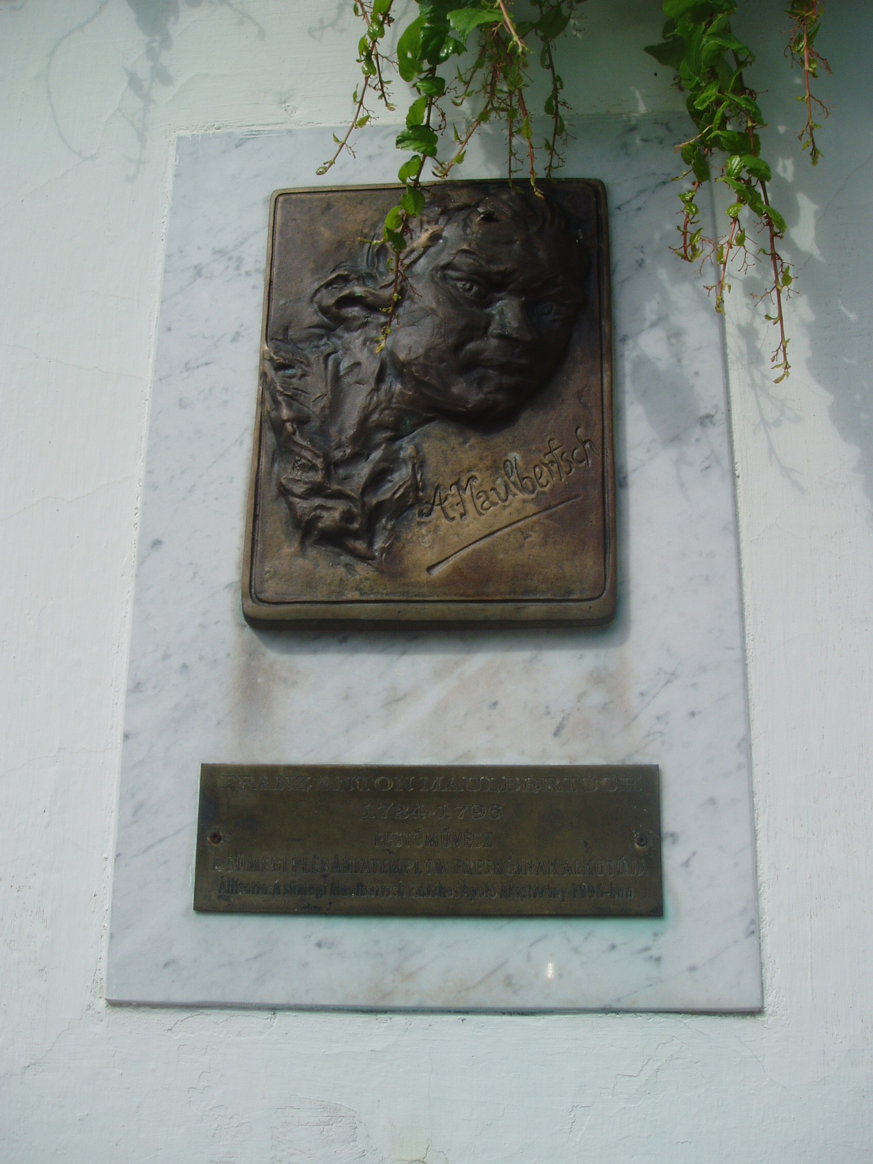 Nyilvános 840 | 1410 | Sümeg, Panteonfal. Maulbertsch emléktáblája | A Kisfaludy téren, Kisfaludy Sándor szülőháza előtt alakították ki Sümeg Panteonfalát. A képen Franz Anton Maulbertsch emléktáblája látható, Máger Ágnes alkotása (1996). Felirata: FRANZ ANTON MAULBERTSCH, 1724-1796, festőművész. A sümegi plébániatemplom freskóinak alkotója. Franz Anton Maulbertsch (Langenargen, 1724. június 8. - Bécs, 1796. augusztus 7.) festőművész. 1839-től a bécsi Akadémián tanult. Első önálló nagyszabású műve a bécsi Maria Trau piarista templom mennyezetképe (1753). Freskófestészetének jelentős állomása volt Sümeg 1757-58-ban, amikor Padányi Bíró Márton püspök megbízásából megalkotta a sümegi plébániatemplom (lásd: Sümeg, Bíró M. u. 1.) pompás falfestményeit. Maulbertsch sokat dolgozott Magyarországon (Pozsony, Pápa, Győr, Kalocsa, Szombathely, Zirc, Eger). Élete utolsó befejezett munkáját Prágában készítette el, ahol a Strahov kolostor mennyezetét festette ki. 1796-ban Bécsben hunyt el. A fénykép 2007 júniusában készült. Felh. irod.: Koppány Tibor - Kozák Károly: Sümeg útikalauz. Veszprém, Idegenforgalmi Hivatal, 1965 Látnivalók Veszprém megyében. Miskolc, Well-PRess, 2004 Veszprém megyei életrajzi lexikon. Veszprém, Veszprém Megyei Önkormányzat Közgyűlése, 1998 www.ekmk.hu/emlekhely/Emlekhelyek.html |