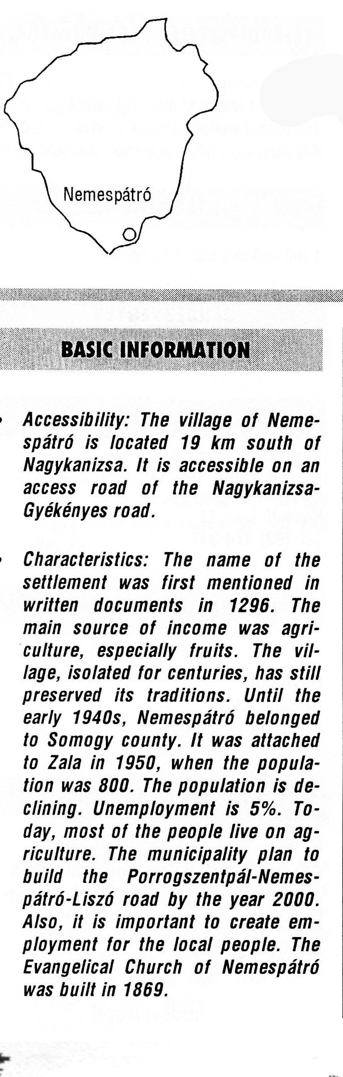 Nyilvános 1885 | 7675 | Nemespátró | BASIC INFORMATION Accessibility: The village of Nemespátró is located 19 km south of Nagykanizsa. It is accessible on an access road of the Nagykanizsa-Gyékényes road. Characteristics: The name of the settlement was first mentioned in written documents in 1296. The main source of income was agriculture, especially fruits. The village, isolated for centuries, has still preserved its traditions. Until the early 1940s, Nemespátró belonged to Somogy county. It was attached to Zala in 1950, when the population was 800. The population is declining. Unemployment is 5%. Today, most of the people live on agriculture. The municipality plan to build the Porrogszentpál-Nemes-pátró-Liszó road by the year 2000. Also, it is important to create employment for the local people. The Evangelical Church of Nemespátró was built in 1869. This text came from the following book: Title: Handbook of Zala county (Zala megye kézikönyve) Series: County handbooks of Hungary (Magyarország megyei kézikönyvei) Chief editor: Hóbor József Publisher: (Hatvan), CEBA-Hungary Ltd, 1998 ETO: 908.439.121(035) ; 050.8(439.121) ISBN: 963-9089-18-2 Pages: 488-1040 p. Remark: Closed on: 1998. márc. 31. |