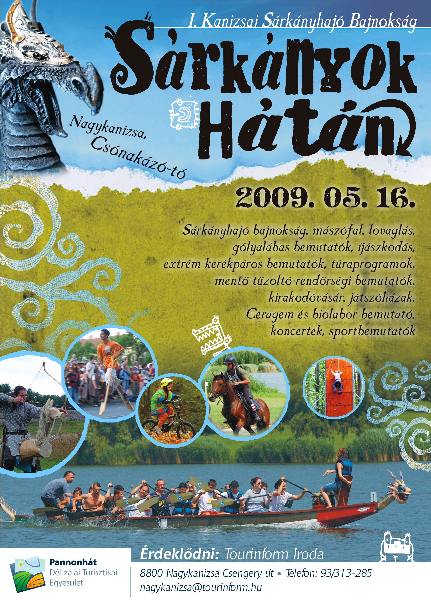Nyilvános 1587 | 3490 | Rövid leírás | Teljes leírás (629 B) | Sárkányok hátán I. Kanizsai Sárkányhajó Bajnokság Nagykanizsa, Csónakázó-tó 2009.05.16. Sárkányhajó bajnokság, mászófal, lovaglás, gólyalábas bemutatók, íjászkodás, extrém kerékpáros bemutatók, túraprogramok, mentő-tűzoltó-rendőrségi bemutatók, kirakodóvásár, játszóházak, Ceragem és biolabor bemutató, koncertek, sportbemutatók Szervező: Pannonhát - Dél-zalai Turisztikai Egyesület Érdeklődni: Tourinform Iroda 8800 Nagykanizsa, Csengery út Tel: 93/313-285 Email: nagykanizsa@tourinform.hu |