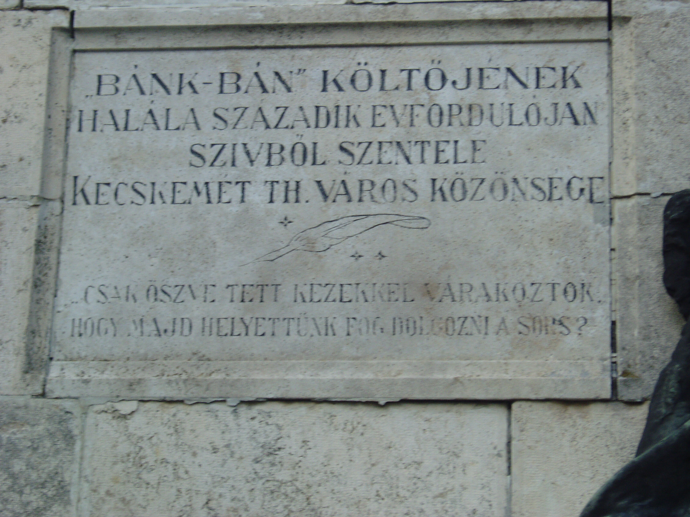 Nyilvános 1162 | 2251 | Kecskemét, Béke fasor 71A. Köztemető: Katona József sírja | Az 1960-as években kialakított, nyárfákkal szegélyezett Béke fasor vezet Kecskemét Köztemetőjébe. Már a bejárattól jól látható Katona József hatalmas síremléke. Katona József 1830. április 16-án Kecskeméten hunyt el (lásd: Bács-Kiskun megye: Kecskemét, Kossuth tér). Ez a mostani már a harmadik nyughelye, Hamvait 1963-ban szállították ide egy felszámolásra ítélt temetőből. Monumentális síremléke még 1930-ban, halálának 100. évfordulója alkalmából készült. A klasszicizáló szarkofágot kőtömbre helyezték egy borostyánnal befuttatott egyméteres kiemelkedésen. A körbefutó hármas lépcsőn Petur bán bronzalakja áll. Az alkotó eredeti terveiben Tiborcot kívánta megjeleníteni az emlékművön, de az akkori várospolitikusok inkább a nemes Petur mellett döntöttek... A fénykép 2006 augusztusában készült. Felh. irod.: Heltai Nándor: Kecskemét. Kecskeméti Lapok, 1998 |