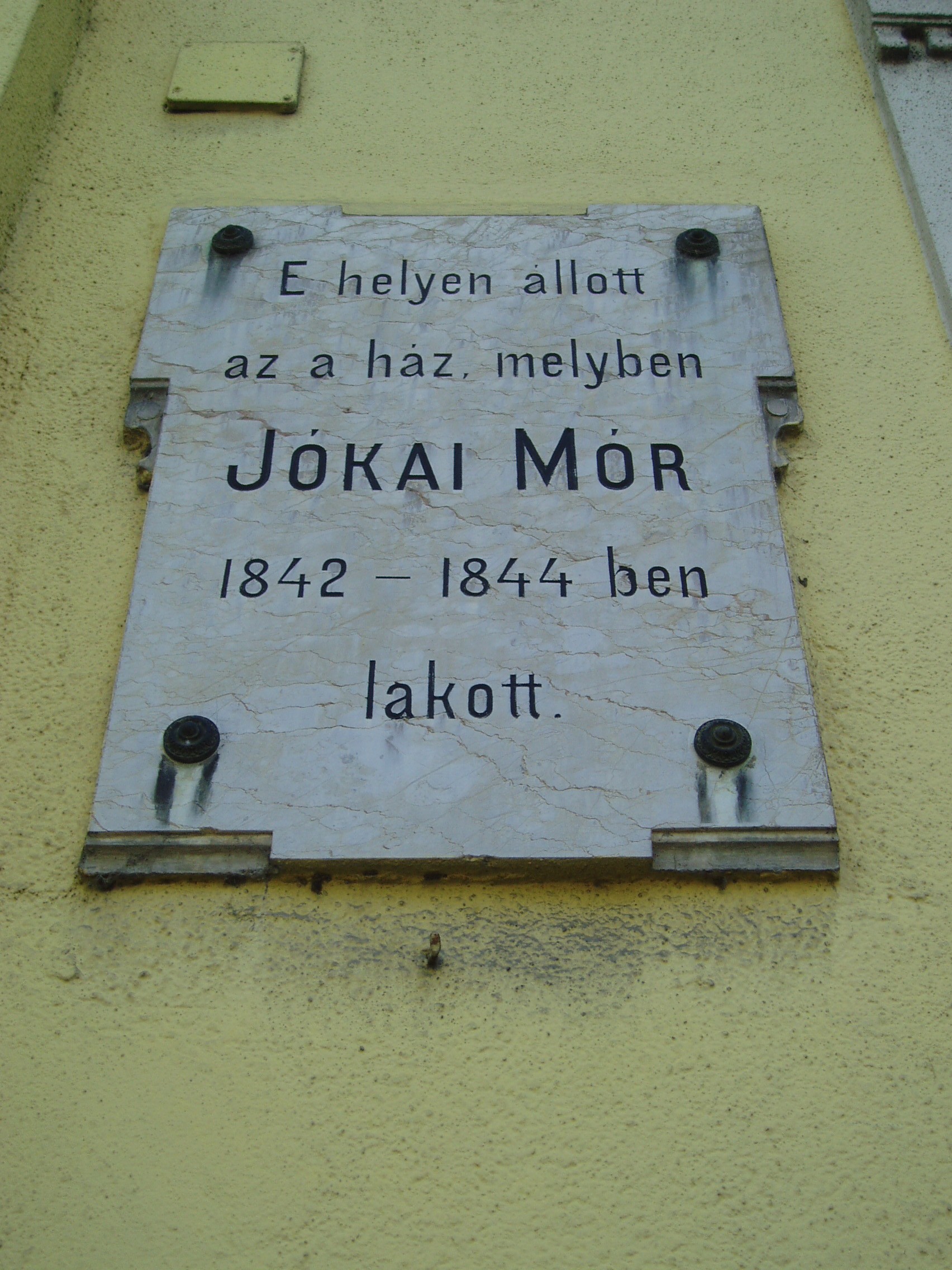 Nyilvános 1177 | 2133 | Kecskemét, Jókai utca 6-8. | Diák korában a korábban ezen a helyen állott épületben, Gyenes Mihályék házában lakott Jókai Mór 1842-44 között. Házigazdája nagy tudású városi mérnök volt, aki az akkor még festőművésznek készülő fiút gyakran magával vitte környékbeli útjaira. Az ekkoriban megismert meg népszokásokat, mint például a pünkösdi király választást vagy a pusztai párbajt később regényeiben is megörökítette. Házigazdájának is köszönhetően írta később: "Itt lett belőlem ember és különösen itt lett belőlem magyar író." Emléktábláját még életében, írói működésének 50. évfordulóján avatták fel. A fénykép 2006 augusztusában készült. Felh. irod.: Heltai Nándor: Kecskemét. Kecskeméti Lapok, 1998 |