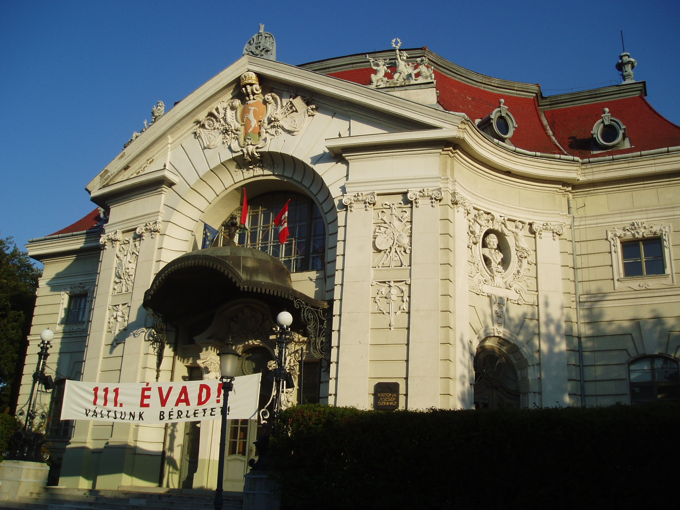 Nyilvános 1130 | 1911 | Kecskemét, Katona József tér 5. Katona József Színház | A színház a Magyarországon is sokat dolgozó, kitűnő, elsősorban színházépítésre specializálódott bécsi Hermann Helmer és Ferdinand Fellner tervei szerint 1895–96-ban épült eklektikus stílusban. Főhomlokzatán Katona József és Kisfaludy Sándor szobrai láthatók. Megnyitó előadásán Katona József Bánk bánja került színre Szacsvay László, Jászai Mari és Márkus Emília főszereplésével. Az egyik közeli utcában (lásd: Kecskemét, Katona József utca 5.) született és élt Katona József nevét 1916-ban vette fel. Több alkalommal ünnepelték a színházteremben a kecskeméti születésű Kodály Zoltánt, mint például 1947. december 18-án, amikor a város díszpolgára lett. Kodály nyolcvanadik születésnapjának szintén itt megünnepelt estjét 1962. december 16-án különösen emlékezetessé tette, hogy Illyés Gyula maga olvasta fel Bevezetés egy Kodály–hangversenyhez című versét — aznap Illyés jelenlétében Kodály avatta fel a színház mögött Vígh Tamás Katona József–emlékművét. A budapesti Vígszínházra emlékeztető, városképi jelentőségű, gyönyörű színházépületet Juhász Gyula nevezte először ékszerdoboznak. Belső terének vörös–arany színű, igazi klasszikus látványát a filmesek is felfedezték: eddig mintegy húsz magyar és külföldi játékfilmet forgattak itt, köztük a Richard Wagner és Liszt Ferenc életéről szóló filmsorozatok, valamint Az operaház fantomja című rockopera filmváltozatának egyes jeleneteit. A fénykép 2006 augusztusában készült. Felh. irod.: Heltai Nándor: Kecskemét. Kecskeméti Lapok, 1998 |