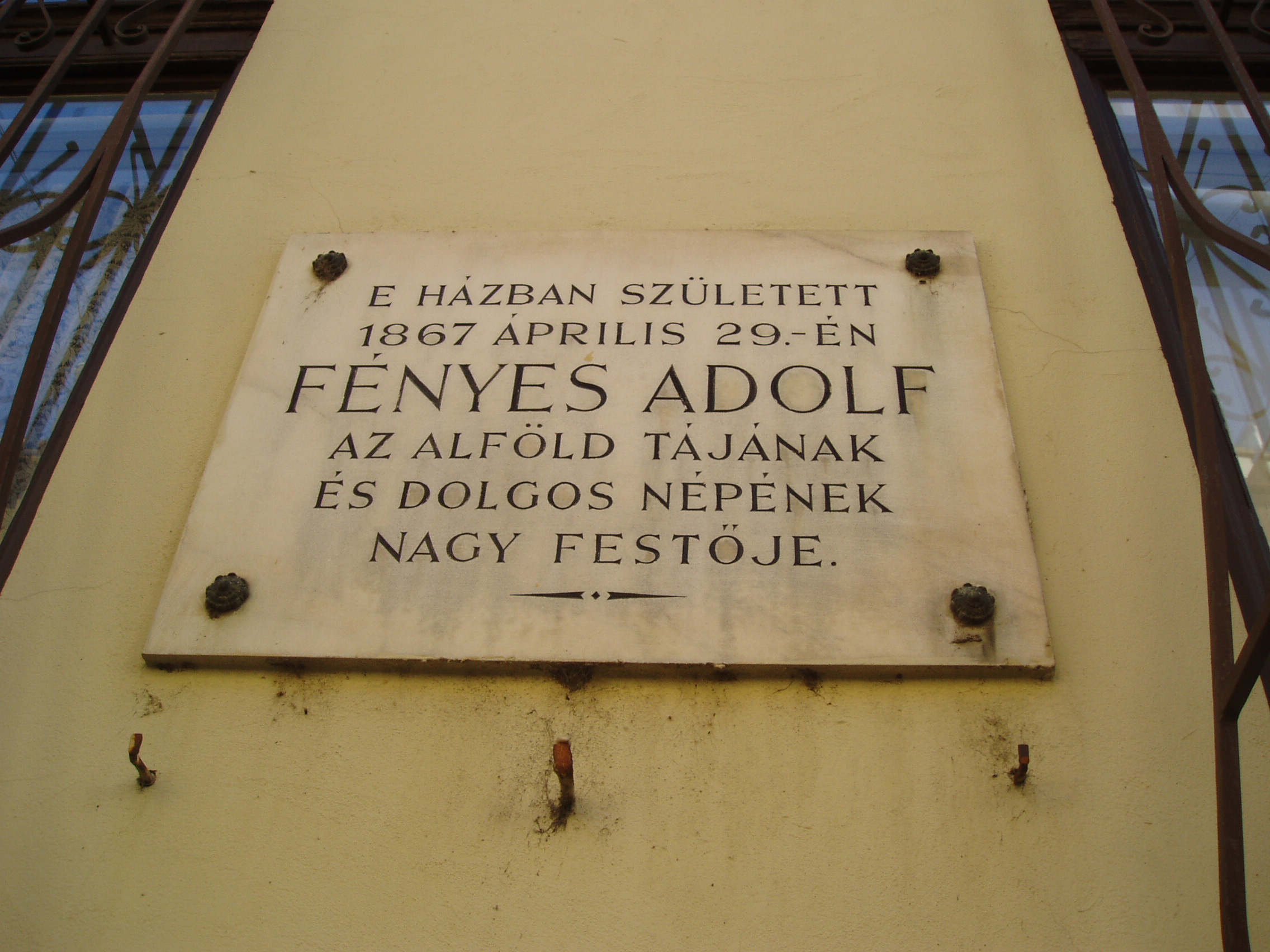 Nyilvános 939 | 1630 | Kecskemét, Wesselényi utca 6. | Az emeletes városi házon olvasható emléktábla szerint itt született 1867. április 29-én Fényes Adolf. Heltai Nándor, kecskemét történetének kutatója szerint a tábla szövege pontatlan, mert a festőművész nem ebben a házban, hanem a helyén állott korábbi épületben született. Szerinte ez a ház Moór Emánuel zongoraművész és feltaláló szülőháza. Ő viszont Fényes Adolfnál néhány évvel korábban, 1863-ban született, tehát - ha Heltai információja helyes - ő sem ebben a házban, hanem az elődében látta meg a napvilágot. A fénykép 2006 augusztusában készült. Felh. irod.: Heltai Nándor: Kecskemét. Kecskeméti Lapo, 1998 |