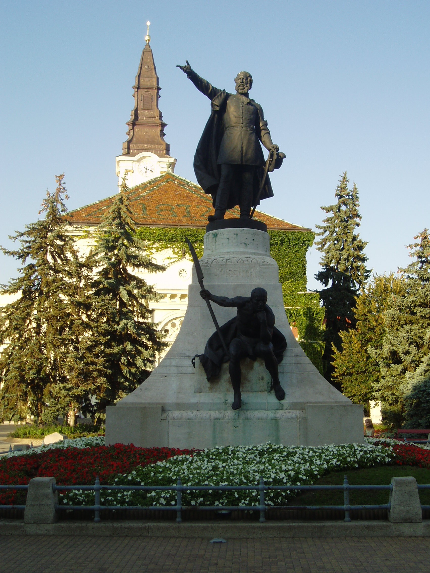 Nyilvános 1091 | 1938 | Kecskemét, Kossuth tér: Kossuth Lajos szobra | Kossuth Lajos 2 és fél méter magas bronzszobrát, Telcs Ede alkotását 1906-ban avatták fel Kecskemét központjában. Az alkotás az 1848/49-es forradalom és szabadságharc emléke mellett Kossuth 1848. szeptember 25-én — ugyanezen a helyen, az akkori régi vásártéren — elmondott toborzó beszédét is felidézi. A szobor ülő mellékalakja kiegyenesített kaszát tart a kezében. E mellékalakról maga a szobrász mondta, hogy ugyan Rodin: Gondolkodó című híres szobrához nagyon hasonló pózban ül, de megfeszített izmokkal, készen rá, hogy ha Kossuth „mégegyszer azt üzeni”, a kezében tartott kiegyenesített kaszával rögtön rámenjen az osztrákra. A helyi hagyomány szerint e mellékalak modellje Kacsóh Pongrác, a János vitéz alapján írt daljáték zeneszerzője volt. A fénykép 2006 augusztusában készült. Felh. irod.: Heltai Nándor: Kecskemét. Kecskeméti Lapok, 1998 Orosz Andrea: Kiskunság és Felső-Bácska. Bp. Frigoria, 2004 |