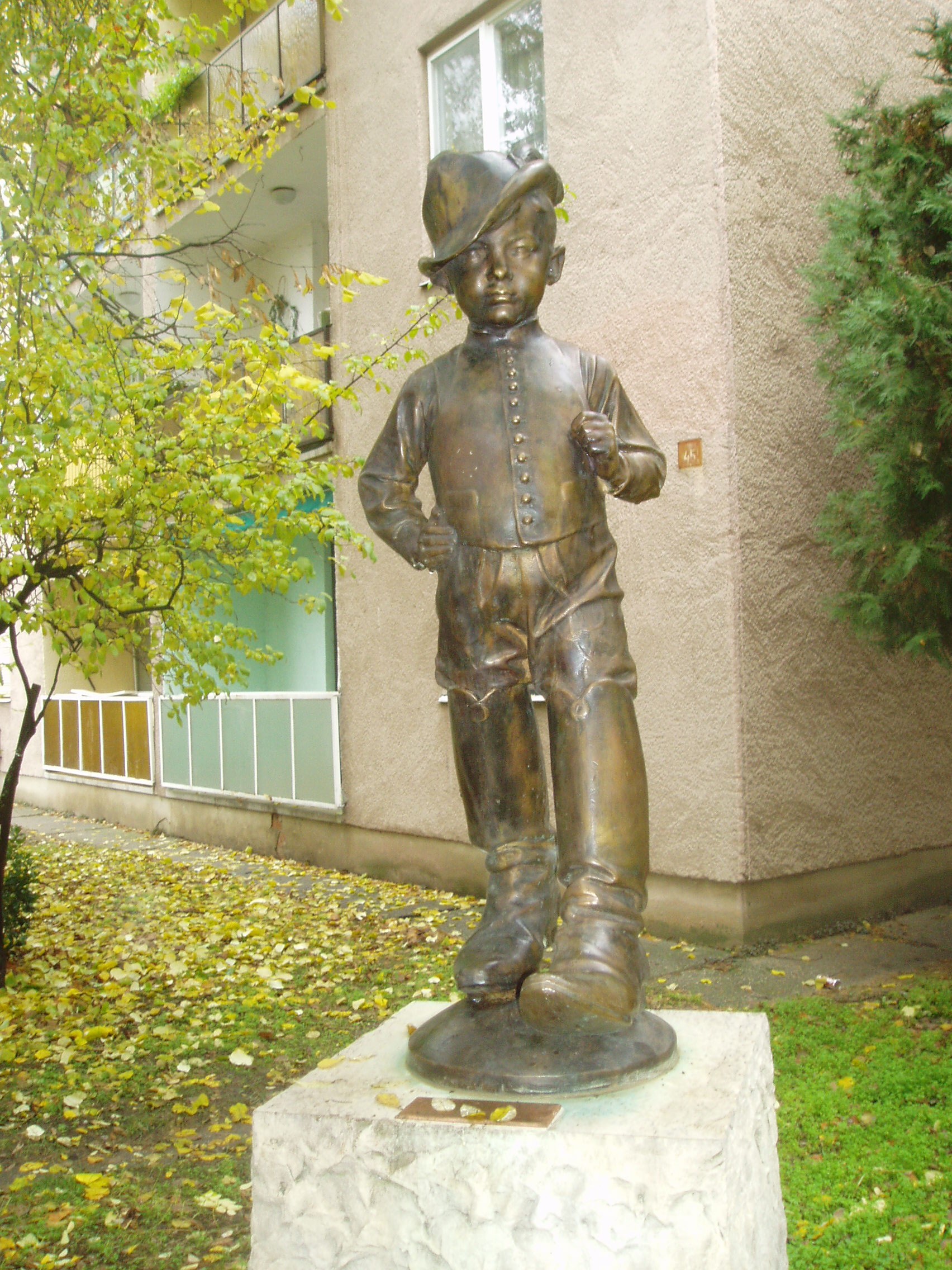 Nyilvános 1098 | 2026 | Baja, Kölcsey utca 45. Hüvelyk Matyi szobra | A József Attila lakótelepen, a Kölcsey utca 45. számú épület előtt áll Telcs Ede: Hüvelyk Matyi című kedves szobra. A kecskeméti Katona József Könyvtár honlapján közzétett "Történelmi és kegyeleti emlékhelyek" című összeállítás szerint a szobor csak másolat, eredeti példányát a Türr István Múzeum őrzi. Alkotója, Telcs Ede Baján született 1872-ben (lásd: Baja, Táncsics M. u. 28.). A fénykép 2007 októberében készült. |