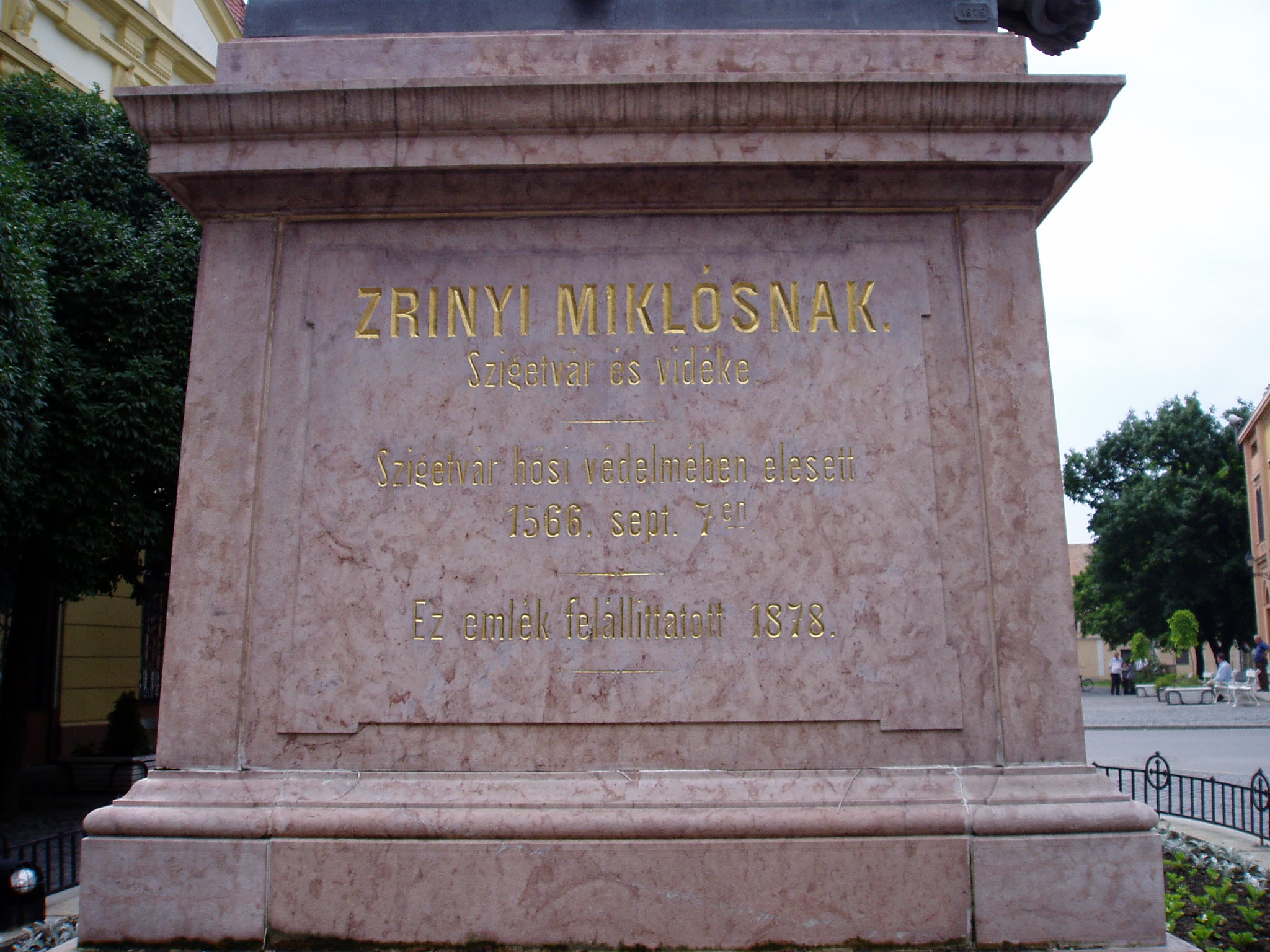 Nyilvános 1046 | 1731 | Szigetvár, Zrínyi tér: Oroszlános emlékmű | Zrínyi Miklós és a szigetvári hősök tiszteletére 1878-ban állították fel a Zrínyi tér északi részén az ún. oroszlános emlékművet. A szobor talapzatán Vörösmarty Mihály sorai olvashatók: "HONFI, HA FELLÉPENDSZ DÜLEDÉK VÁRÁRA SZIGETNEK, / SÍRVA NE EMLÍTS SZÓT SAJNOS ELESTE FELŐL, / OTT HŐS ZRÍNYI KÖRÜL BÁTOR DALIÁK NYUGOSZNAK, / GYÖNGE PANASZ SZÓZAT BÁNTJA NAGY ÁLMAIKAT." A fénykép 2005 júniusában készült. Felh. irod.: Látnivalók Pécsett és Baranyában. Miskolc, Well-PRess, 1998 |