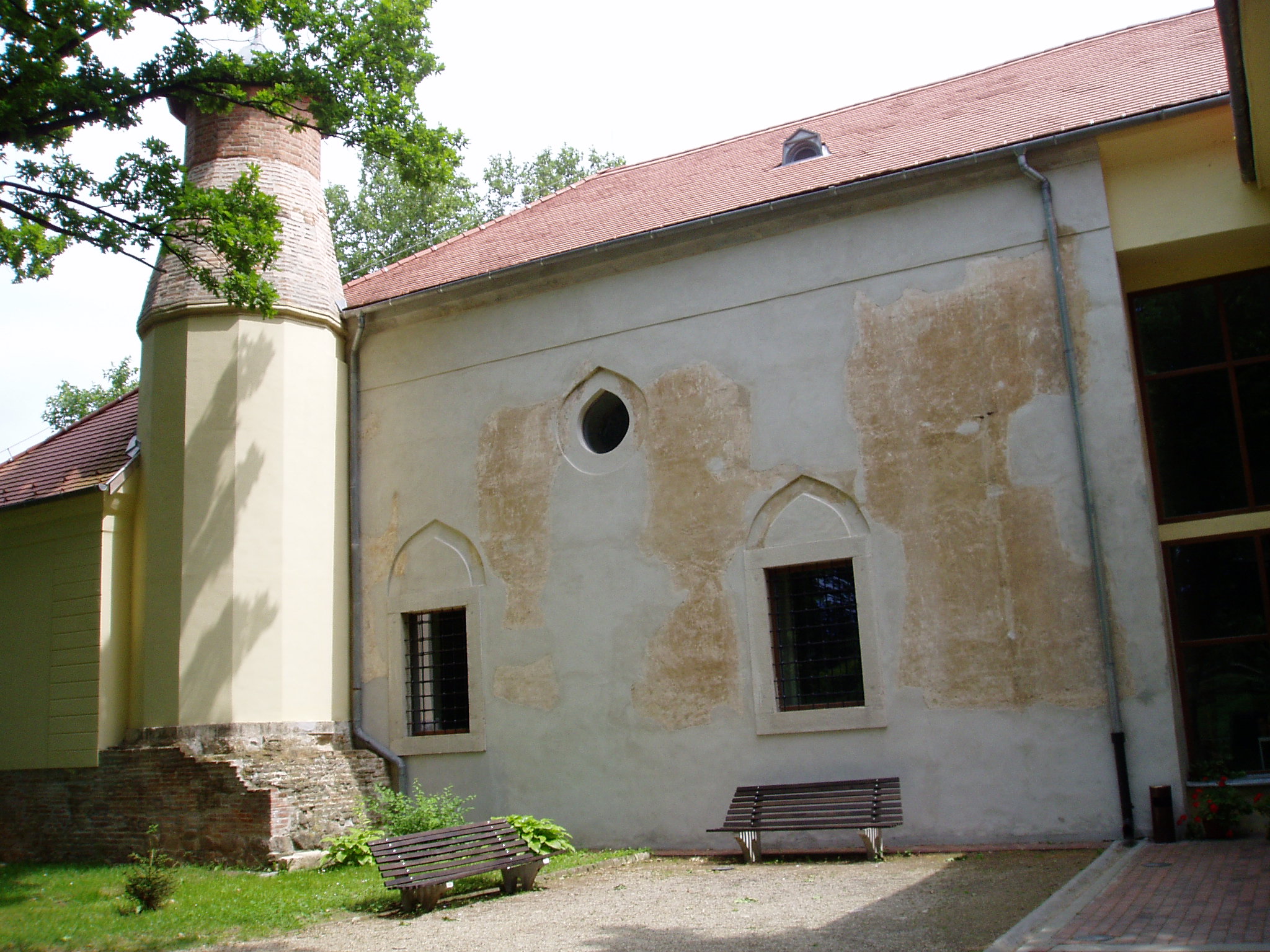 Nyilvános 1301 | 2894 | Szigetvár, Vár: dzsámi | A vár egyik központi épülete a Szulejmán dzsámi, amely a győztes szultán tiszteletére épült a XVI. században. A téglalap alaprajzú dzsámi Mekka felé néző oldalán látható a kőkeretes, egykor csempével borított, szalaktit boltozatú imafülke (mihrab). A dzsámit L alakú folyosó veszi körül, ennek délkeleti oldalán egy másik mihrab fülke található. Északnyugaton csatlakozik a dzsámihoz a szabályos tizennégyszög alakú minaret, amelynek nagy része a XVIII. században leomlott. A fénykép 2005 júniusában készült. Felh. irod.: Török műemlékek Magyarországon. = www.terebess.hu/keletkultinfo/minaret/szigetvar.html |