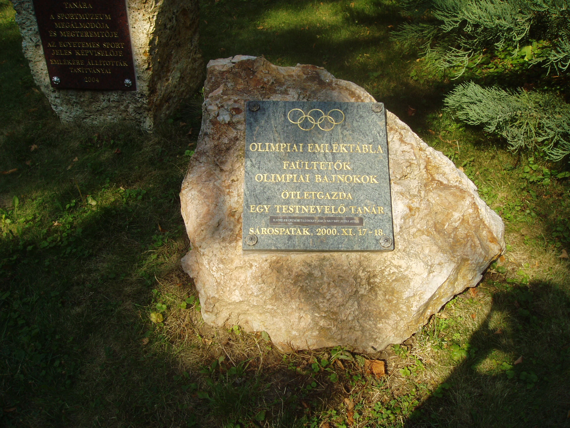 Nyilvános 1014 | 1632 | Sárospatak, Iskolakert: A pataki diákok emlékezete | A Református Kollégium (lásd: Sárospatak, Rákóczi u. 1.) bejáratával szemben találjuk az Iskolakertnek nevezett parkot. Az 1980-as években természetvédelmi területté nyilvánított Iskolakert sajátos nemzeti érték, mely egyedülálló az országban. Sétányai mentén Patakhoz kötődő jeles személyiségek szobrai állnak. Az iskolakertben álló műemlék tornacsarnok közelében is elhelyeztek néhány feliratos emlékkövet. A képen a 2000-ben felállított Olimpiai emléktábla látható. A fénykép 2007 augusztusában készült. Felh. irod.: Látnivalók Borsod-Abaúj-Zemplén megyében. Miskolc, Well-PRess, 1995 |