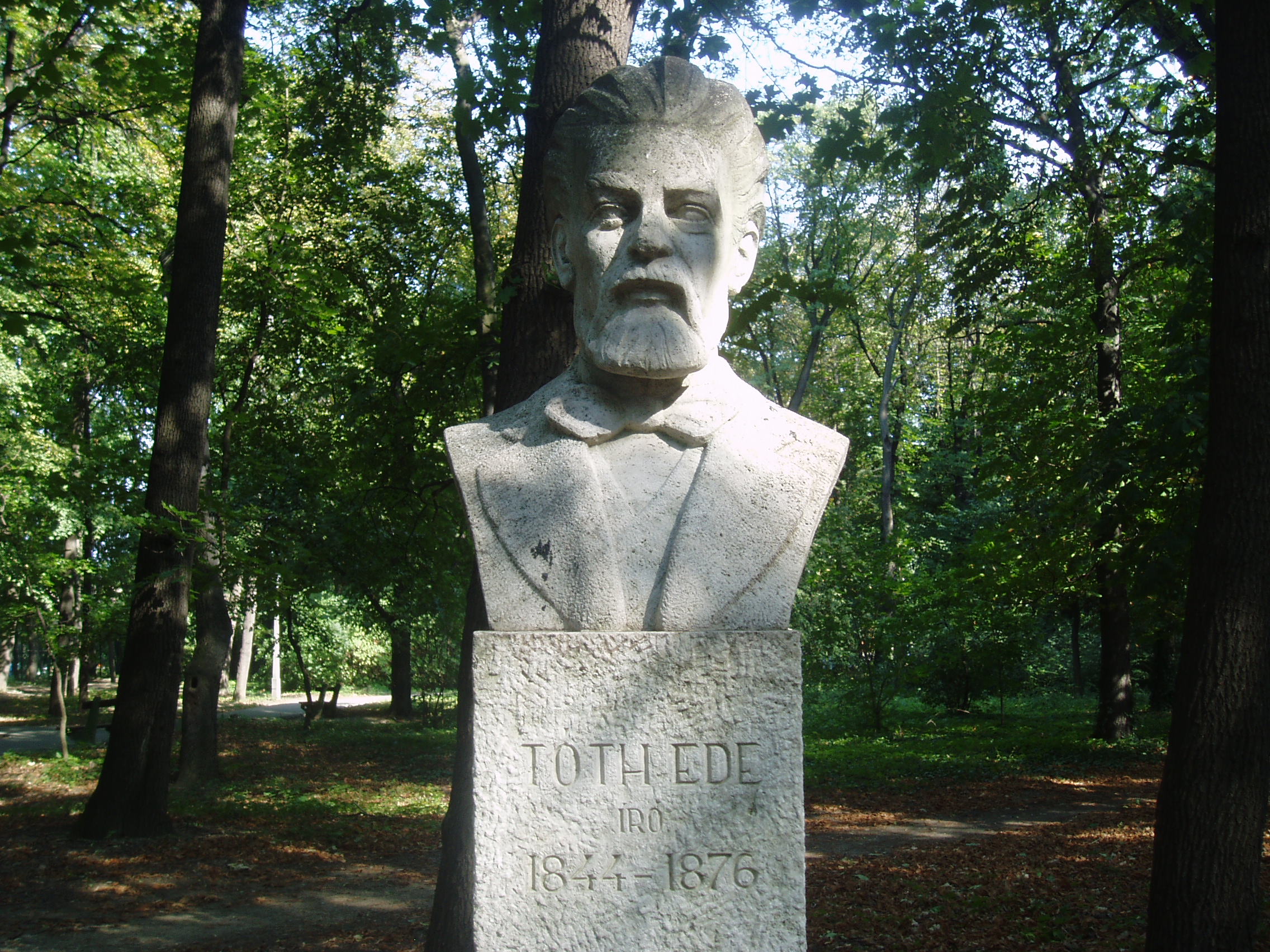 Nyilvános 1068 | 2055 | Sárospatak, Iskolakert: Tóth Ede szobra | A Református Kollégium (lásd: Sárospatak, Rákóczi u. 1.) bejáratával szemben találjuk az Iskolakertnek nevezett parkot. Az 1980-as években természetvédelmi területté nyilvánított Iskolakert sajátos nemzeti érték, mely egyedülálló az országban. Sétányai mentén Patakhoz kötődő jeles személyiségek szobrai állnak. Tóth Ede (1844-1876) író kőből faragott mellszobra Ugray György alkotása (1972). Az egykori pataki diák sok nyomorgás után, iskoláit abbahagyva 1864-ben vándorszínésznek állt. Éveken át rendületlenül próbálkozott az írással, de tehetségét addig nem fedezték fel, míg 1874-ben meg nem írta "A falu rossza" című színművét, mellyel elnyerte a 100 arany értékű Nemzeti Színház 100 arany értékű pályadíját, s egy csapásra híressé vált. A sok nélkülözés azonban annyira megrongálta egészségét, hogy tüdőbaján már nem lehetett segíteni. Rövid munkásságával is új lendületet tudott adni a népszínműnek. A fénykép 2007 augusztusában készült. Felh. irod.: Látnivalók Borsod-Abaúj-Zemplén megyében. Miskolc, Well-PRess, 1995 www.sarospatak.hu/nevezetessegek Magyar életrajzi lexikon |