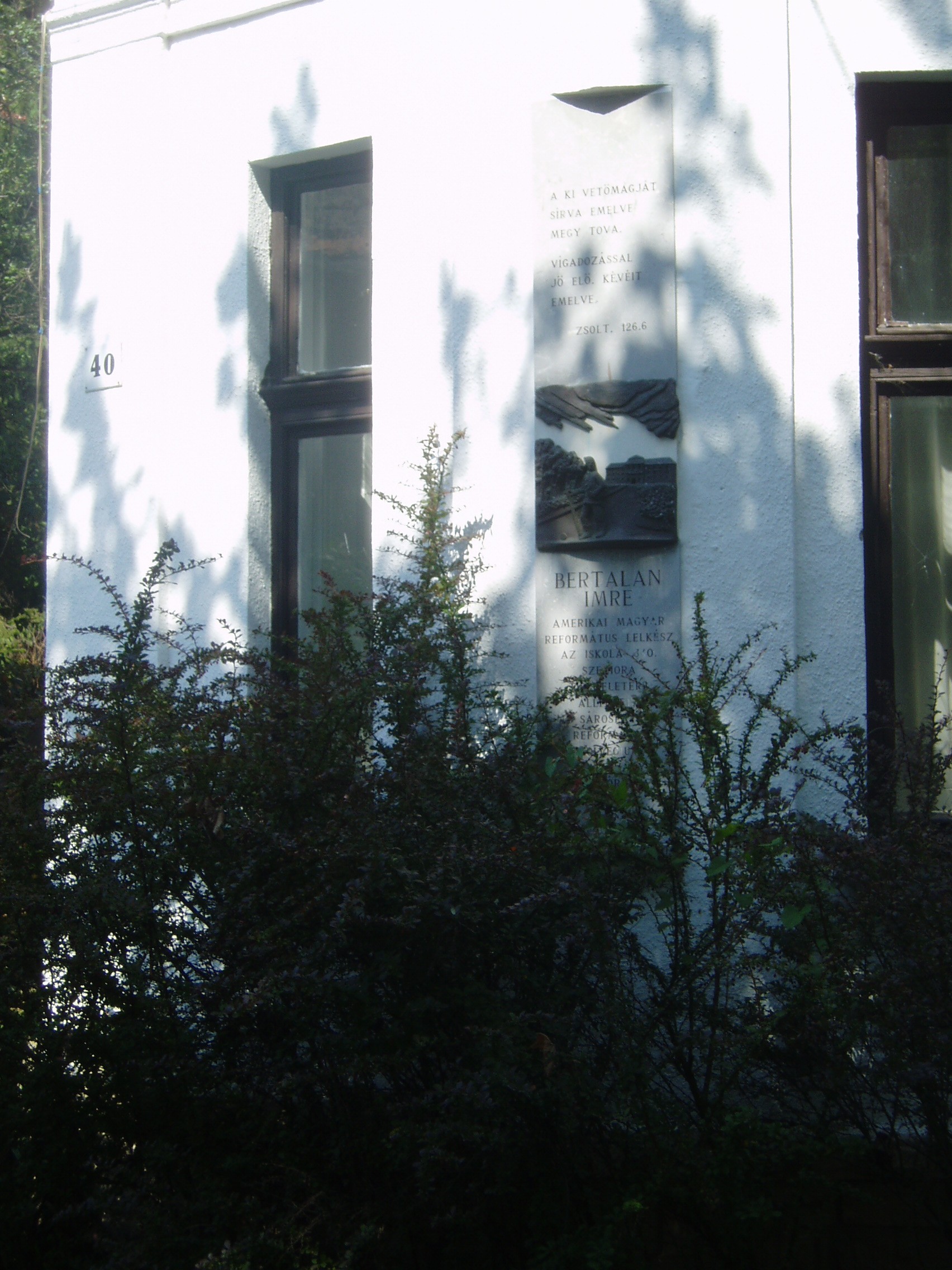Nyilvános 1002 | 1699 | Sárospatak, Kazinczy utca 40. | Az Öregdiák vendégház, más néven Bertalan-ház homlokzatán Bertalan Imre amerikai-magyar lelkipásztor, a Református Kollégium (lásd: Sárospatak, Rákóczi u. 1.) 340. szeniora emléktáblája látható. Bertalan Imre az 1940-es évek elején volt pataki diák. A Kazinczy utcai lakóházat, ő adományozta volt iskolájának. Az épületet a kollégium alapítványa vette gondozásába, amely a mai és az öregdiákok különböző összejöveteleinek színhelyéül szolgál - a tudományos előadásoktól az öregdiák találkozókig. A fénykép 2007 augusztusában készült. Felh. irod.: Hű maradt Patakhoz. = www.patakidiak.hu/bertalan/ |