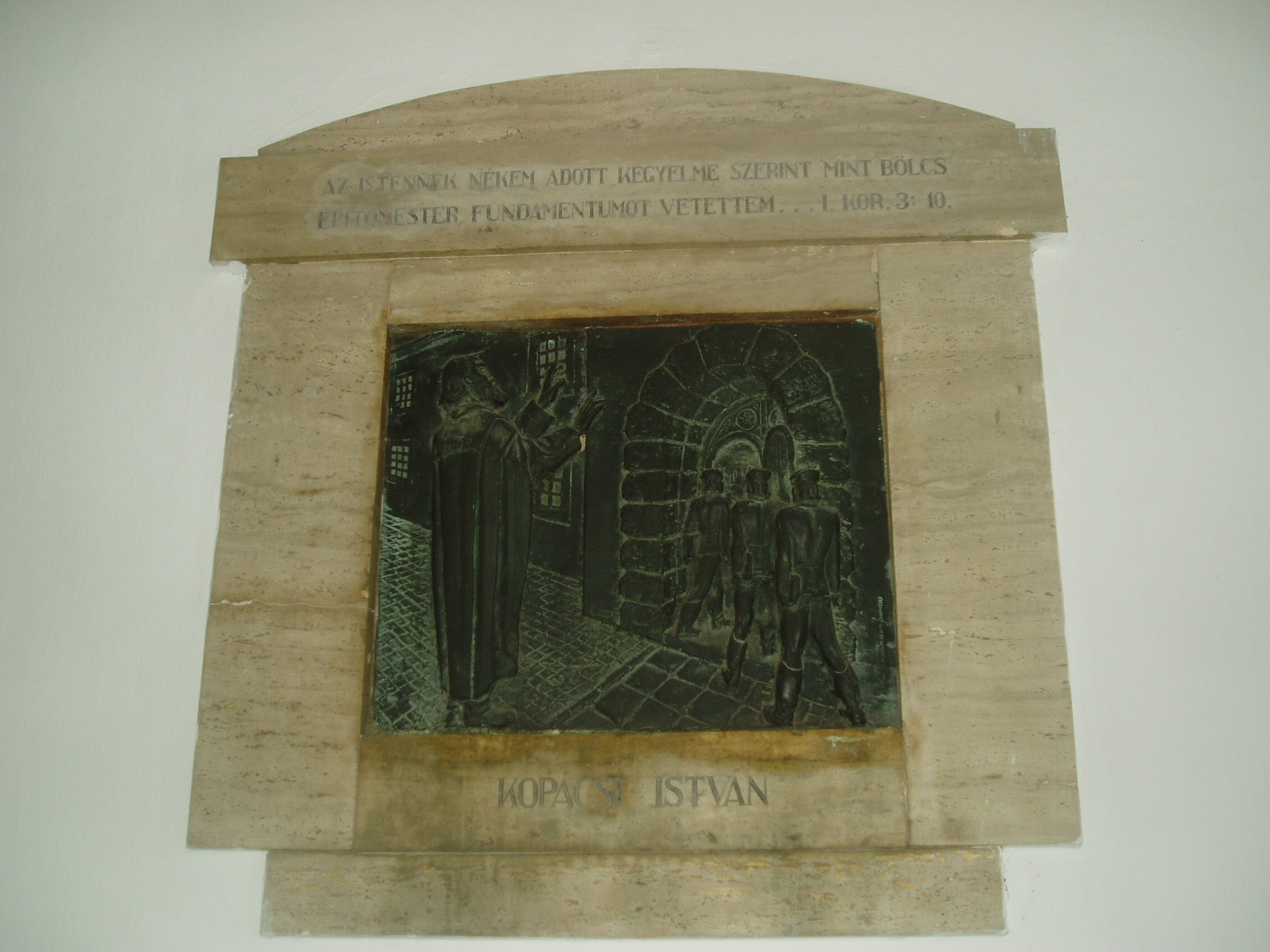 Nyilvános 1002 | 1460 | Sárospatak, Rákóczi utca 1. Református Kollégium | A kollégium főépülete, a Nagy Kollégium a Rákóczi út északi végén található, mely 1804–1814 között korai klasszicista stílusban épült. Szép ráccsal ellátott, háromíves nyílású kapuzat vezet be az un. „nagyportá”-ba, amelyet két sor vaskos pillér három hajóra oszt. Kétoldalt a falakon az iskolatörténet néhány fontosabb eseményének, illetve a kollégium nagy alakjainak bronz domborművű ábrázolásait helyezték el. A képen Kopácsi István domborműve látható. Kopácsi István ferences rendi szerzetes volt, őt állította az 1531-ben alapított református iskola élére Perényi Péter, Patak földesura. Az 1937-ben felavatott dombormű alkotója Dózsa Farkas András. A fénykép 2007 augusztusában készült. Felh. irod.: Détsy Mihály: Sárospatak. Bp. Corvina, 1974 Látnivalók Borsod-Abaúj-Zemplén megyében. Miskolc, Well-PRess, 1995 www.sarospatak.hu/nevezetessegek |