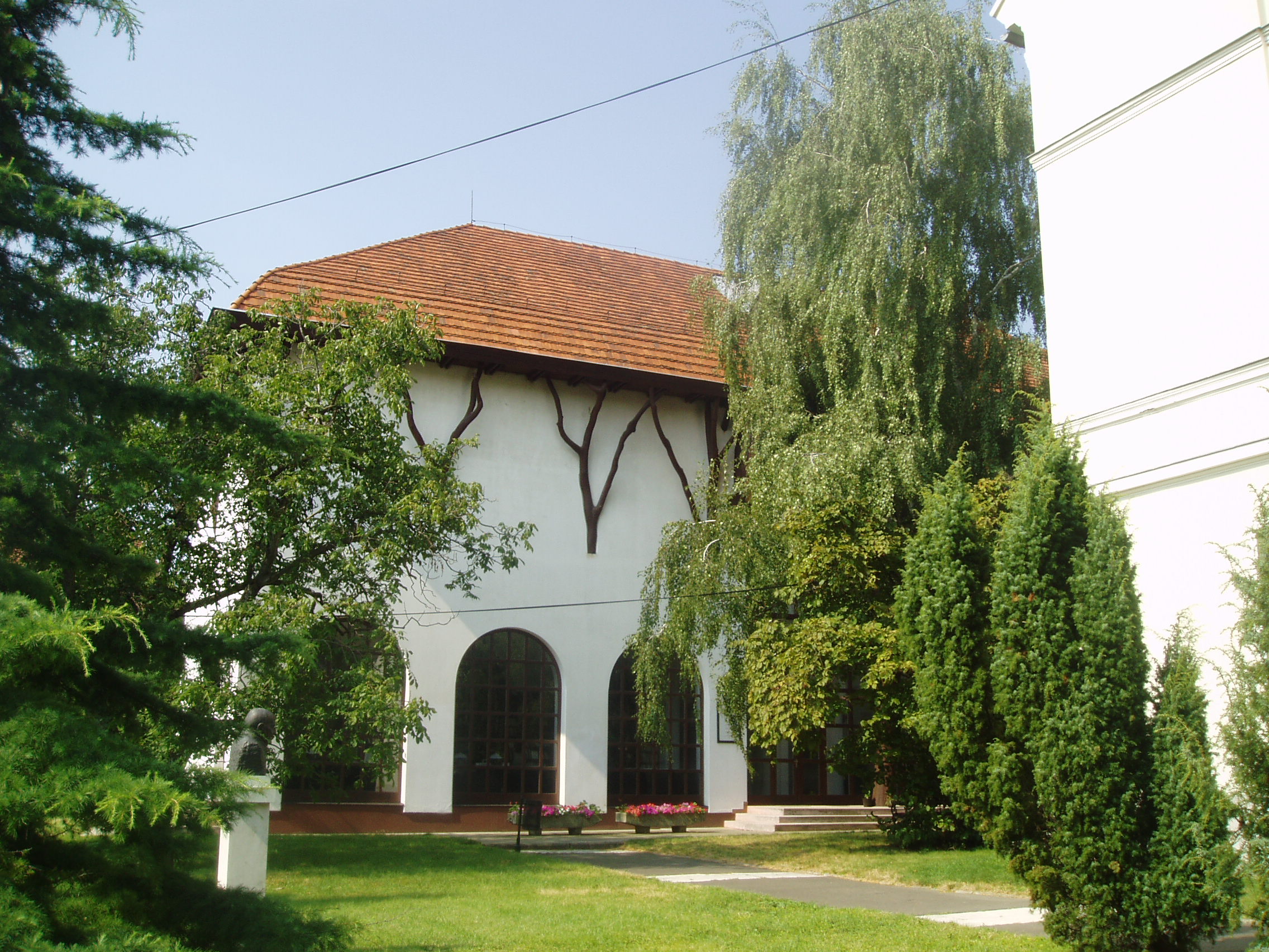 Nyilvános 1002 | 1518 | Sárospatak, Rákóczi utca 1. Református Kollégium Repositoriuma | A Kollégium udvarán jobbra emelkedik a Makovecz Imre által tervezett, 1986-ban emelt Repositorium. Az épület a könyvtári, levéltári, adattári raktárak mellett helyet ad jeles személyiségek - többségükben egykori pataki diákok - hagyatékának, könyvgyűjteményének. Itt van Béres Ferenc zenei könyvtára (1988); Cs. Szabó László londoni könyvtára (1985); Halmi Róbert modern angol nyelvű könyvtára (1987); Király István irodalomtörténeti gyűjteménye (2006); Szathmáry Lajos amerikai magyar emigrációs hagyatéka (1987); Vitéz Ferenc amerikai magyar református püspök könyvtára (2002). A fénykép 2007 augusztusában készült. Felh. irod.: Látnivalók Borsod-Abaúj-Zemplén megyében. Miskolc, Well-PRess, 1995 |