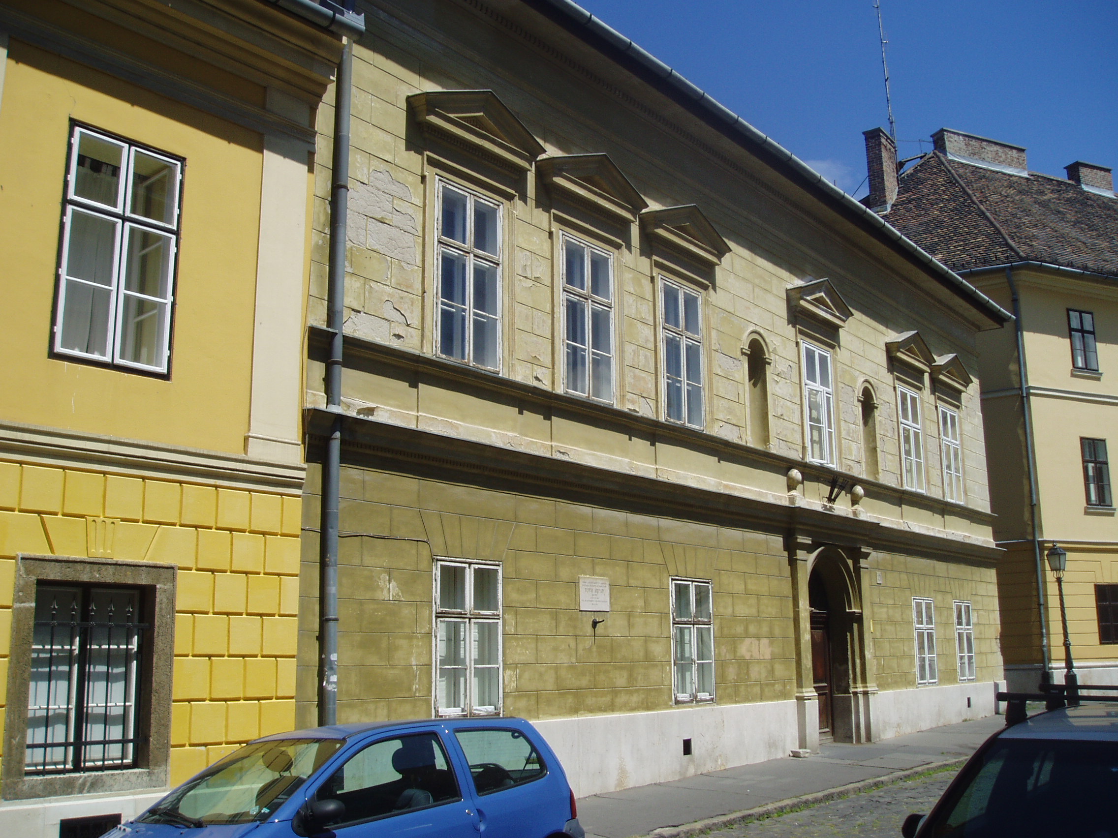 Nyilvános 1151 | 1885 | Budapest I. Táncsics Mihály utca 13. | Az egyemeletes ház középkori alapokra épült. 1823-ban, majd mai formájára 1880-ban alakították át. Mint a homlokzatán elhelyezett emléktáblán is olvasható, itt élt - egy első emeleti kis, bérelt lakásban - élete utolsó tíz évében Tóth Árpád (1886-1928) költő feleségével, Annuskával és 1920-ban született kislányával, Eszterrel. Itt írta Az öröm illan és a Lélektől lélekig c. köteteinek legtöbb versét. Lakásán hunyt el 1928. november 7-én tüdőbajban. Lánya, Tóth Eszter, aki édesapja halálakor mindössze nyolc éves volt, szintén irodalmár - költő, író, műfordító -lett. Édesapjáról, családjáról - köztük apai nagyapjáról, Tóth András szobrászról - emlékezéseket, tanulmányokat írt, bennük sok eredeti forrást, levelet is közzétett. A fénykép 2007 májusában készült. Felh. irod.: Zakariás G. Sándor: Budapest. Bp., Képzőműv. Alap, 1961 /Magyarország művészeti emlékei 3./ Erős Zoltán: Magyar irodalmi helynevek A-tól Z-ig. 2. bőv. átd. kiad. Bp. Kis-Lant Kiadó, 1995 Tóth Eszter: Családi emlékek Tóth Árpádról. Bp. Magvető, 1985 |