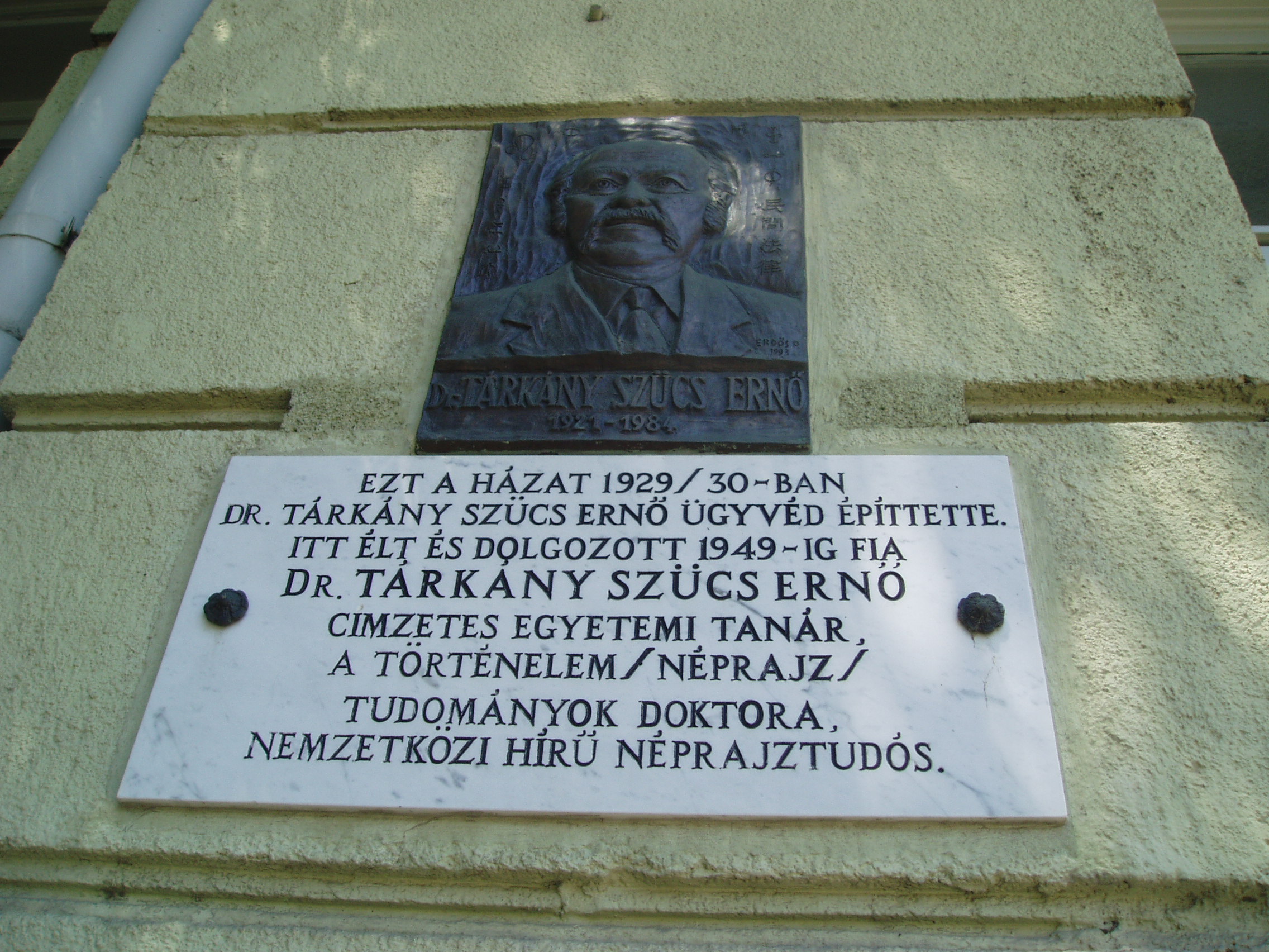 Nyilvános 820 | 1281 | Hódmezővásárhely, Szántó Kovács János utca 13. | Mint a homlokzaton elhelyezett, portrédomborművel díszített emléktáblán olvasható, ezt a házat 1929/30-ban Tárkány Szűcs Ernő ügyvéd építtette. Itt élt és dolgozott 1949-ig fia, Tárkány Szűcs Ernő (1921-1984) nemzetközi hírű jogtudós és néprajzkutató. A kolozsvári egyetem elvégzése után 1945-ben hazatért szülővárosába, ahol a Tornyai Társaság titkárává választották és szerkesztette a Puszták Népét, a társaság folyóiratát. 1950-től Budapesten élt. Fő kutatási területe a jog és a népszokások összefüggése volt. A fénykép 2007 júliusában készült. Felh. irod.: www.emlekpont.hu |