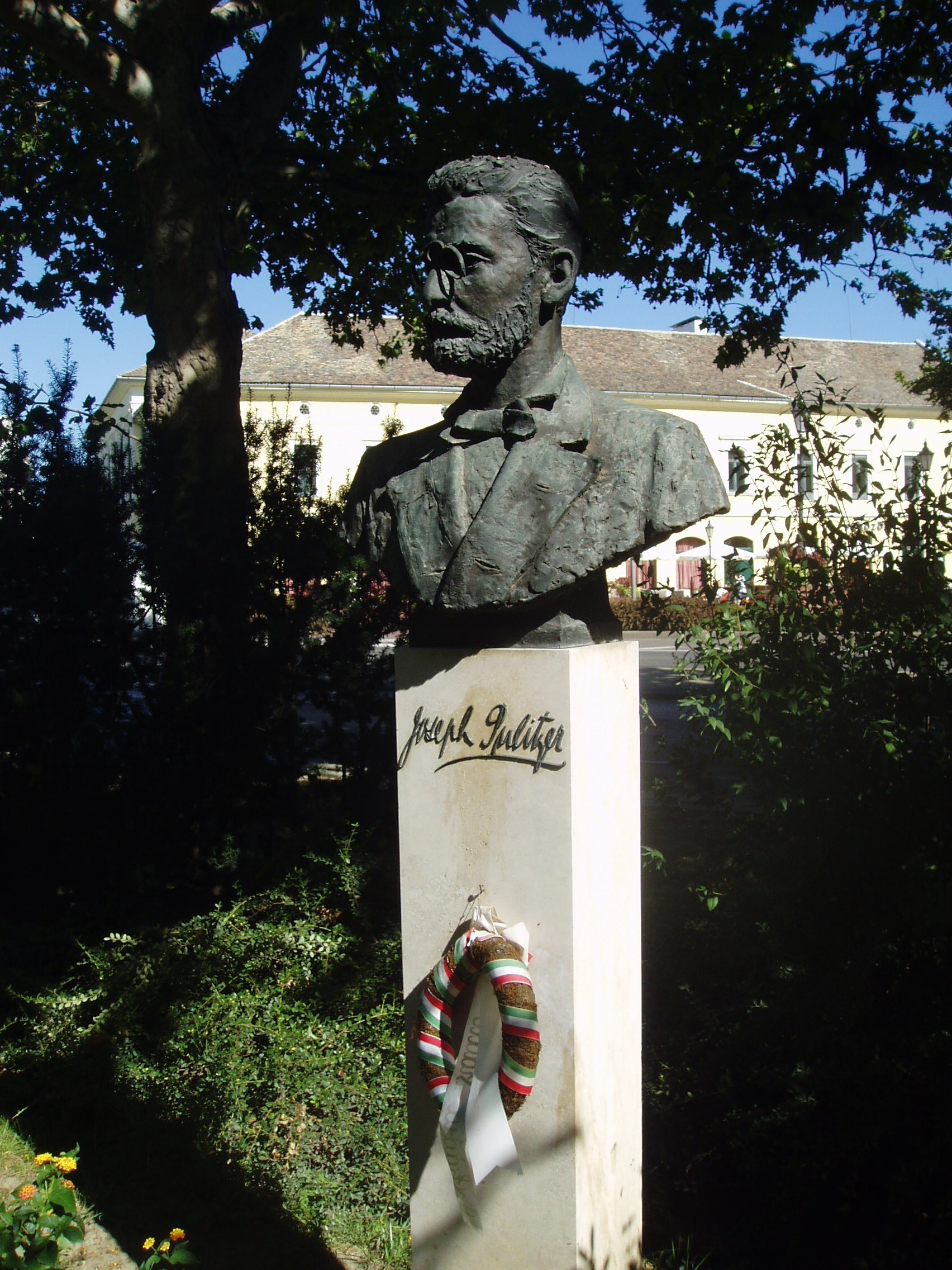 Nyilvános 794 | 1223 | Makó, Széchenyi tér 13-15. | A Széchenyi teret déli oldalról az 1970-ben épült ún. csipkeházsor határolja, földszintjén üzletekkel. A házsor előtti kis parksávban a makói születésű Pulitzer József (1847-1911) mellszobra áll (Kiss Jenő alkotása). Az egyetemes sajtótörténet kiemelkedő alakja a makói városháza közelében, az Úri utca 4. számú, azóta emléktáblával megjelölt házban született (sajnos, amikor Makón jártam, ezt az információt még nem tudtam, ezért nincs róla kép - K.K.). Elszegényedett kereskedőcsaládból származott, iskoláit Budapesten végezte. A katonai pálya iránt vonzódott, de gyenge egészsége, rossz szeme miatt sorra elutasította az osztrák hadsereg, a francia idegenlégió és az angol gyarmati hadsereg. Tizenhat évesen hajófűtőként vándorolt ki Amerikába, ahol még éppen részt vehetett a polgárháború utolsó szakaszában. A Vadnyugaton számos mesterséget megpróbált, volt sikertelen öszvérápoló, bálnavadász és temetőgondnok, végül bánatában újságírónak állt. Egy St. Louis-i német laphoz szegődött el, ahol hamar kedveltté váltak színes, érdekes írásai. Fokozatosan egyre nagyobb részesedést vásárolt az újságban, végül tulajdonos lett, majd felvásárolta és egyesítette a város lapjait. Miután 1869-ben megkapta az amerikai állampolgárságot, New Yorkba költözött, ahol - a Hearst-lapokkal rivalizálva - megalapította saját média-birodalmát. Romló látása és gyengülő egészsége miatt 1887-től fokozatosan visszavonult a napi munkától, de az irányítást megtartotta. Jachtján hunyt el 1911-ben. Benne tisztelik a modern hírlapírás atyját, aki azt vallotta: "a sajtó legfőbb küldetése nem csupán a hírközlés, hanem a közszolgálatiság". Magyarságát soha nem tagadta meg, egyszer haza is látogatott. Ő volt az amerikai Kongresszus első magyar származású tagja. Nevét emléktábla őrzi a New York jelképének számító Szabadság-szobor alján: ő szervezte meg a szobor felállítását segítő sajtókampányt. Hatalmas vagyonának nagy részét is jótékonysági célokra adományozta. Az általa létrehozott alapítvány kamataiból osztják 1917 óta minden évben a mára legendává vált Pulitzer-díjakat, az újságírók legnagyobb és legirigyeltebb kitüntetéseit. A díjazottak között olyan nagyságok szerepelnek, mint John Steinbeck, Ernest Hemingway vagy John F. Kennedy. Hazánkban 1991 óta ítélik oda a Joseph Pulitzer-emlékdíjakat. A fénykép 2007 júliusában készült. Felh. irod.: Barangolások Csongrád megyében. Miskolc, Well-PRess, 1997 www.mzsh.hu/pulitzer.html |