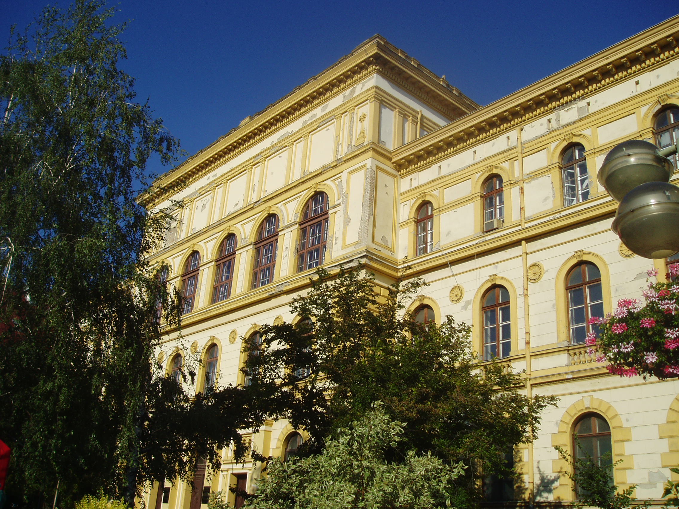 Nyilvános 1042 | 1476 | Szeged, Dugonics tér 13. | A Dugonics tér keleti oldalán áll a központi egyetem klasszicista elemeket tartalmazó, kora eklektikus stílusú, védett épülete. Skalniczky Antal tervei alapján Arleth Ferenc építette 1873-ban. Az épület mind megjelenésében, mind térhatásában Szeged máig egyik legkiemelkedőbb alkotása. Eötvös József kultuszminiszter személyes helyszíni tárgyalásai alapján főreáliskolának épült, s 1880-tól helyet adott a Somogyi-könyvtárnak is. A könyvtárat Ferenc József itt nyitotta meg 1883. október 16-án. 1894-ben az épületet át kellett engedni a Szegeden három évvel korábban fölállított királyi ítélőtáblának, majd 1921-ben a Kolozsvárról áttelepült tudományegyetem költözött falai közé. 1925 őszéig itt működött a bölcsészeti kar, ide járt 1924 őszétől József Attila (részletesebben lásd: Szeged, Dugonics tér 2. és 3. kép). A fénykép 2007 júliusában készült. Felh. irod.: Péter László: Szeged. Bp. Panoráma, 1981 |