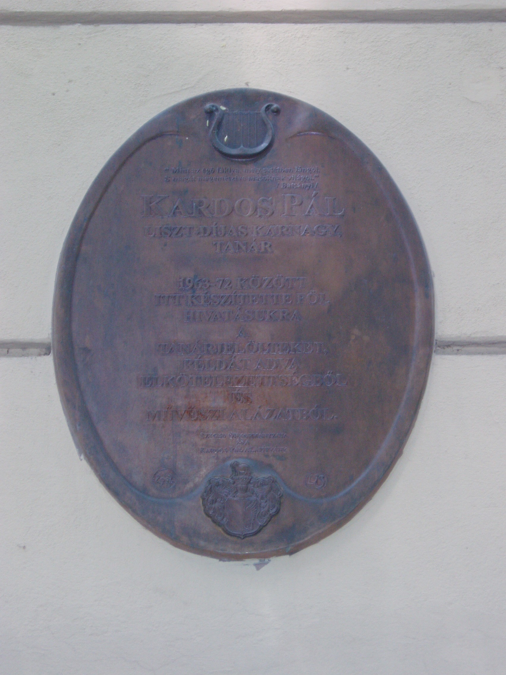 Nyilvános 1049 | 1676 | Szeged, Szentháromság utca 70-76. | Az egyházi Karolina Iskola épületében az elmúlt rendszer idején a Juhász Gyula Tanárképző Főiskola Ének–zene Tanszéke működött. Itt tanított Kardos Pál Liszt–díjas karnagy, aki 1961–1972 között a főiskola leánykarát is vezette. Kardos Pál tanári személyisége, művészi igényessége meghatározóvá vált növendékei és kollégái körében. Emléktábláját 2002. március 22-én avatták fel az épület falán. Az épületen portrédomborműves emléktábla idézi Bálint Sándor néprajztudós (1904–1980), „a legszögedibb szögedi” alakját, aki 1937 és 1941 között az itt működő Iskolanővérek tanítóképzőjének tanára volt. A fénykép 2007 júliusában készült. Felh. irod.: Tizenkét év kőben és ércben. Szeged, Önkormányzat, 2002 |