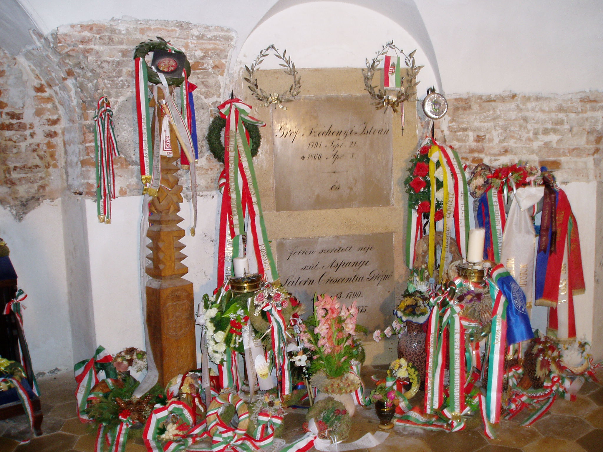 Nyilvános 1447 | 8924 | Nagycenk, Mauzóleum: Széchenyi István és felesége sírja | A Széchényi család nyughelyét a temető létesítésével egyidőben Széchényi Ferenc építtette 1778-ban. A barokk stílusú sírkápolnát 1806-10 között klasszicista előtérrel bővítették. A téglalap alakú előcsarnok kazettás mennyezetét ion oszlopok tartják. Az ovális alaprajzú kápolnát kupola fedi, több kutató véleménye szerint Dorffmeister István freskóival. Innen jutunk a kriptába, a család számos jeles tagjának végső nyughelyére, ahol koszorúszalagok tömege övezi Széchenyi István és felesége, Seilern Crescencia sírkamrájának zárólapját. A fénykép 2005 júliusában készült. Felh. irod.: Látnivalók Győr-Moson-Sopron megyében. Miskolc, Well-PRess, 2000 |