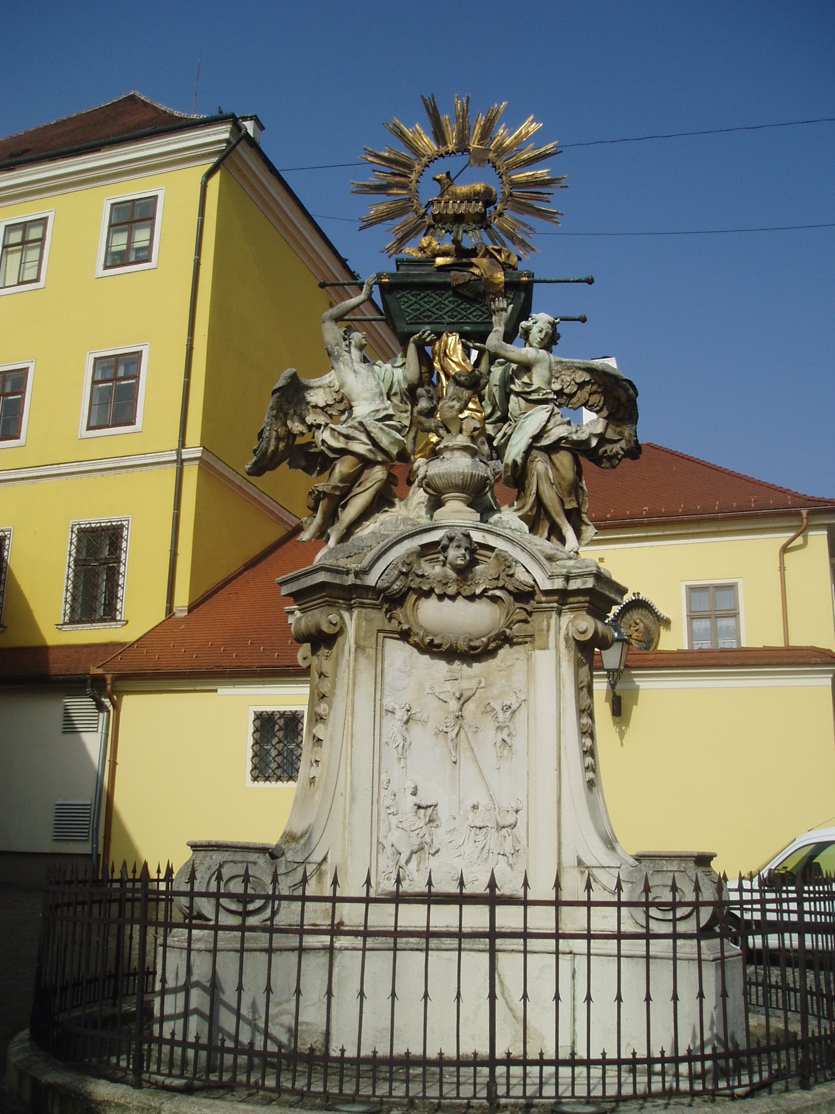 Nyilvános 1097 | 2138 | Győr, Gutenberg tér: Frigyláda | Az Apáca utca tengelyében, de már az olaszos hangulatú kis Gutenberg téren áll a nevezetes Frigyláda szoborcsoport, mely országos viszonylatban is korának egyik legkiemelkedőbb, barokk stílusú műalkotása. Magas alapzaton két lebegő angyal fogja közre a Frigyládát. Felette a glóriával övezett Isten Báránya, az Agnus Dei látható. Alapzatának oldalait vallásos vonatkozású domborművek díszítik. Itteni felállításához egy legenda fűződik. Eszerint 1729-ben egy egyházi körmeneten ministránsruhát öltött egy szökött katona. A vár őrsége felismerte, le akarták fogni, s a dulakodás következtében kiütötték a pap kezéből a monstranciát, amely eltörött. A győri polgárok megbotránkoztak az eseten, s III. Károly király engesztelésként emeltette az esemény színhelyén az emlékművet. A felvétel 2008 május végén készült. Felh. irod.: Cziglényi László: Győr. Bp. Panoráma, 1981 |