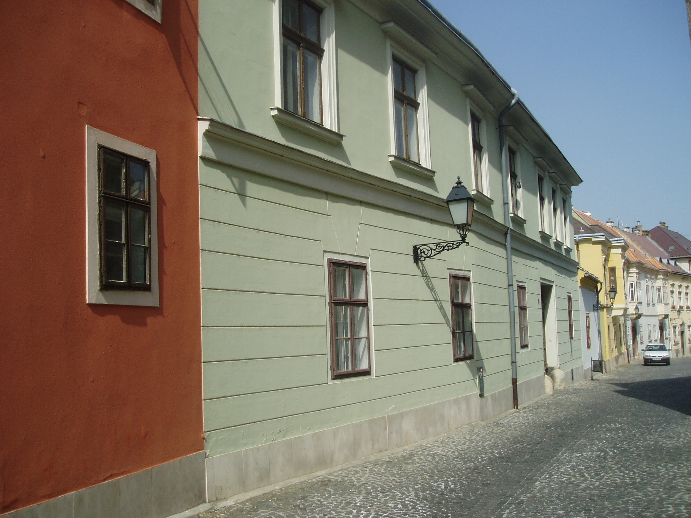 Nyilvános 1021 | 1932 | Győr, Káptalandomb 11. | A székesegyház apszisától kelet felé sétálva, a dombtetőről levezető út mentén találjuk a Káptalandomb legértékesebb műemlékházait. A 11. számú egyemeletes, klasszicista stílusú épület, mai homlokzata az 1800-as évek elején készült. A felvétel 2008 május végén készült. Felh. irod.: Cziglényi László: Győr. Bp. Panoráma, 1981 |