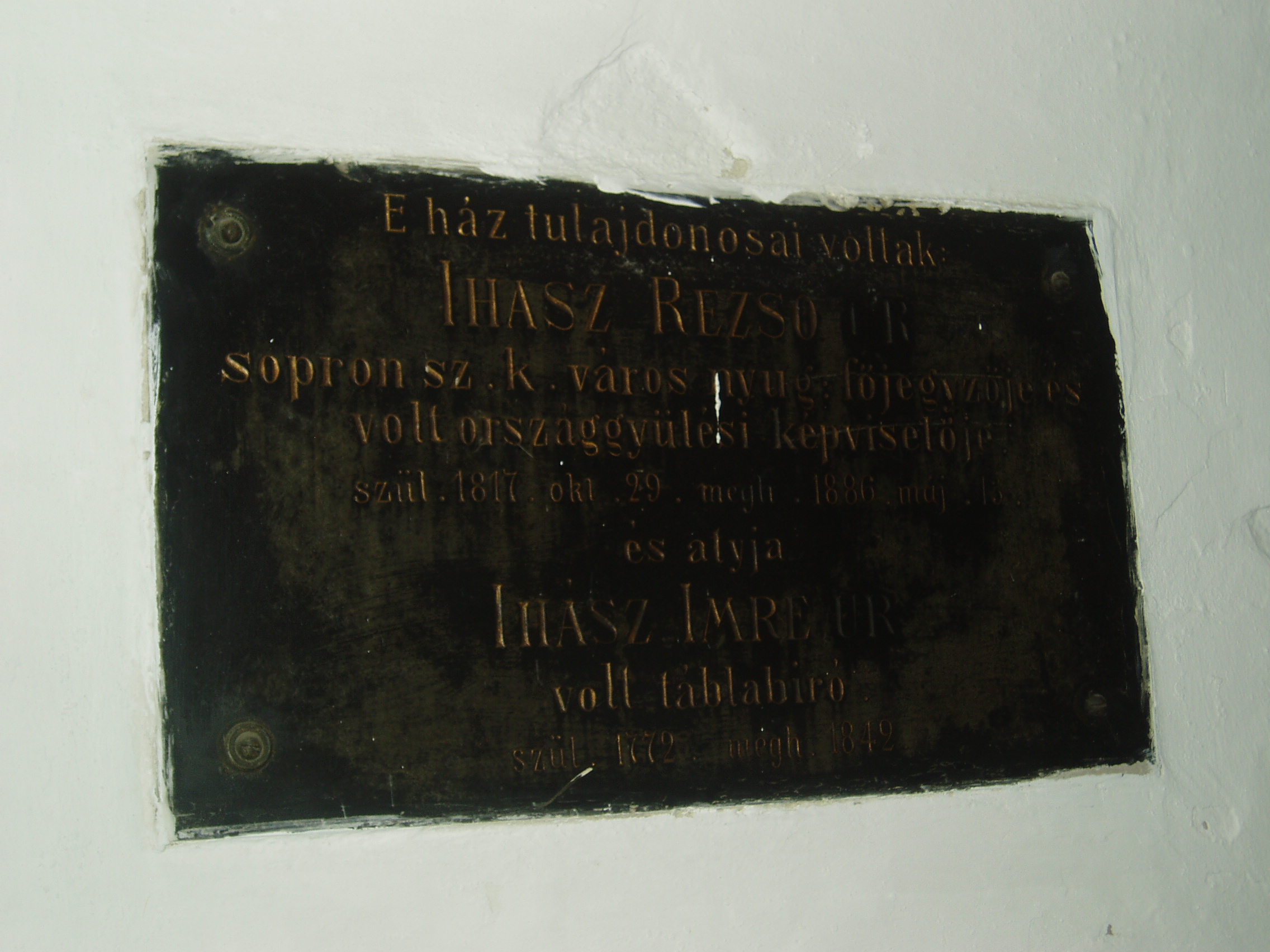 Nyilvános 945 | 1356 | Sopron, Hátsókapu 2. | Az ún. Caesar–ház hatalmas reneszánsz sarokerkélyével a városkép jellegzetes eleme. Helyén valamikor több kisebb, valószínűleg a XV. században épült lakóház állt. Az 1676-ban Sopron belvárosát sújtó nagy tűzvész után ezek megmaradt részei, valamint a belső városfal maradványainak felhasználásával épült fel e pompás kis városi palota. Dongaboltozatos kapualjában megmaradtak a középkori ülőfülkék. Udvari szárnyának emeletén toszkán oszlopos, köríves árkádsor van. Az udvarból a falszorosban kialakított kertbe juthatunk, ahol látható a római és a ráépült középkori városfal, amelyet ablakokkal áttörve az épület hátsó homlokzataként használtak fel. Két emeleti termében megmaradt az 1700 körül készült, kora barokk ornamentális stukkómennyezet. Az 1681-es országgyűlés idején ebben az épületben ülésezett a főrendiház, ekkor választották Magyarország nádorává Esterházy Pál herceget, aki Harmonia caelestis című kantátasorozatával beírta nevét a magyar zenetörténetbe is. Egy fekete márványtábla a ház egykori tulajdonosairól emlékezik meg: Ihász Imre (1772-1842) táblabíróról és fiáról, Ihász Rezső (1817-1886) főjegyzőről, országgyűlési képviselőről. A fénykép 2008 júniusában készült. Felh. irod.: Czellár Katalin: Sopron. 3. jav. kiad. Bp. Panoráma, 2000 |