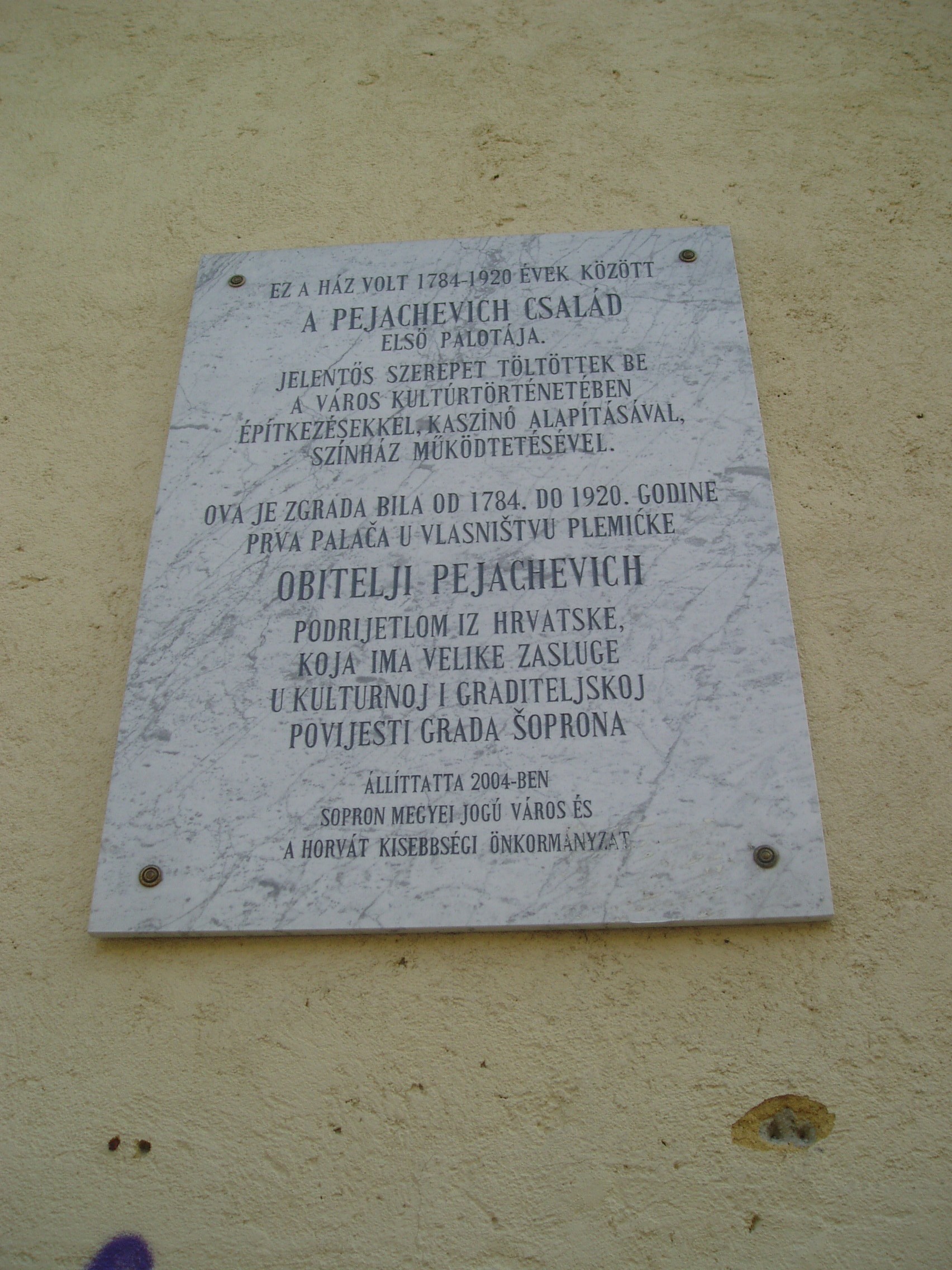 Nyilvános 970 | 1524 | Sopron, Petőfi tér 5. | A Pejachevich-palota valószínűleg már állt a XVII. század végén. 1786-ban vette meg, majd építtette át Pejachevich Károly. A XIX. században is a család birtokolta, amely jelentős szerepet játszott Sopron művelődéstörténetében a kaszinó (lásd: Petőfi tér 3.) és a színház (lásd: Liszt Ferenc utca 2.) alapításával és működtetésével. Falai között járt 1801-ben József nádor és felesége, Alexandra Pavlovna. Mint egy emléktábla is megörökíti, 1893 és 1896 között itt nevelkedett a leendő IV. Károly magyar király. A kép 2008 júniusában készült. Felh. irod.: Czellár Katalin: Sopron. 3. jav. kiad. Bp. Panoráma, 2000 |
