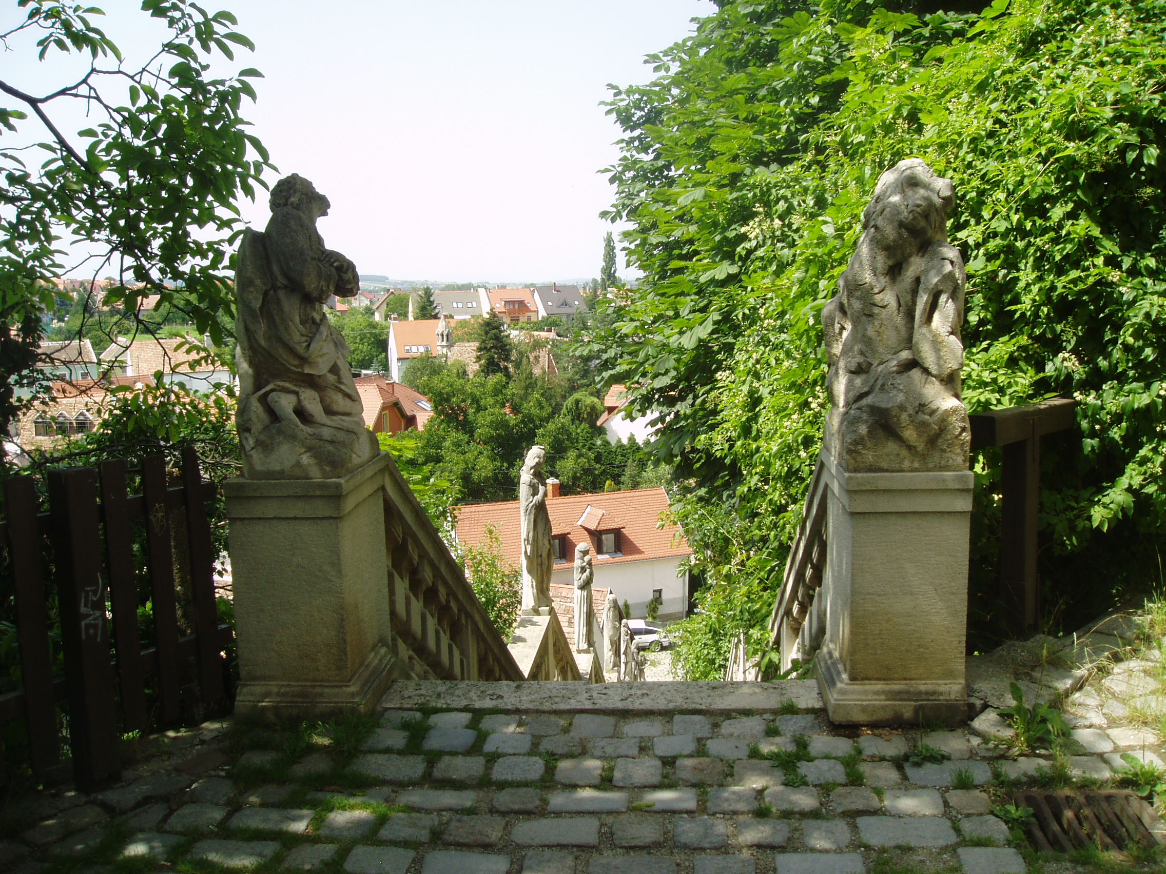 Nyilvános 1032 | 1502 | Sopronbánfalva: Kolostorhegy út: Karmelita templom és kolostor | Sopronbánfalva fölött a Sopronból Brennbergbányára vezető út déli oldán magas domb emelkedik. A dombot uraló gótikus eredetű, első formájában a XV. század végén épült templom és a hozzá csatlakozó barokk kolostorszárnyak eredetileg pálos szerzetesek, majd karmelita apácák otthona volt. Az épületegyüttest a település központjával a meredek domboldalban egyenesen húzódó díszes lépcső köti össze, amelyet karmelita-, vagy pálos lépcsőként ismer a köztudat. A lépcső hét lépcsőkarból és hét pihenőből áll. A pihenőkön, a baluszteres mellvéden jobbról-balról egy-egy szent kőszobra áll. A kép 2008 júniusában készült. Felh. irod.: Czellár Katalin: Sopron. 3. jav. kiad. Bp. Panoráma, 2000 |