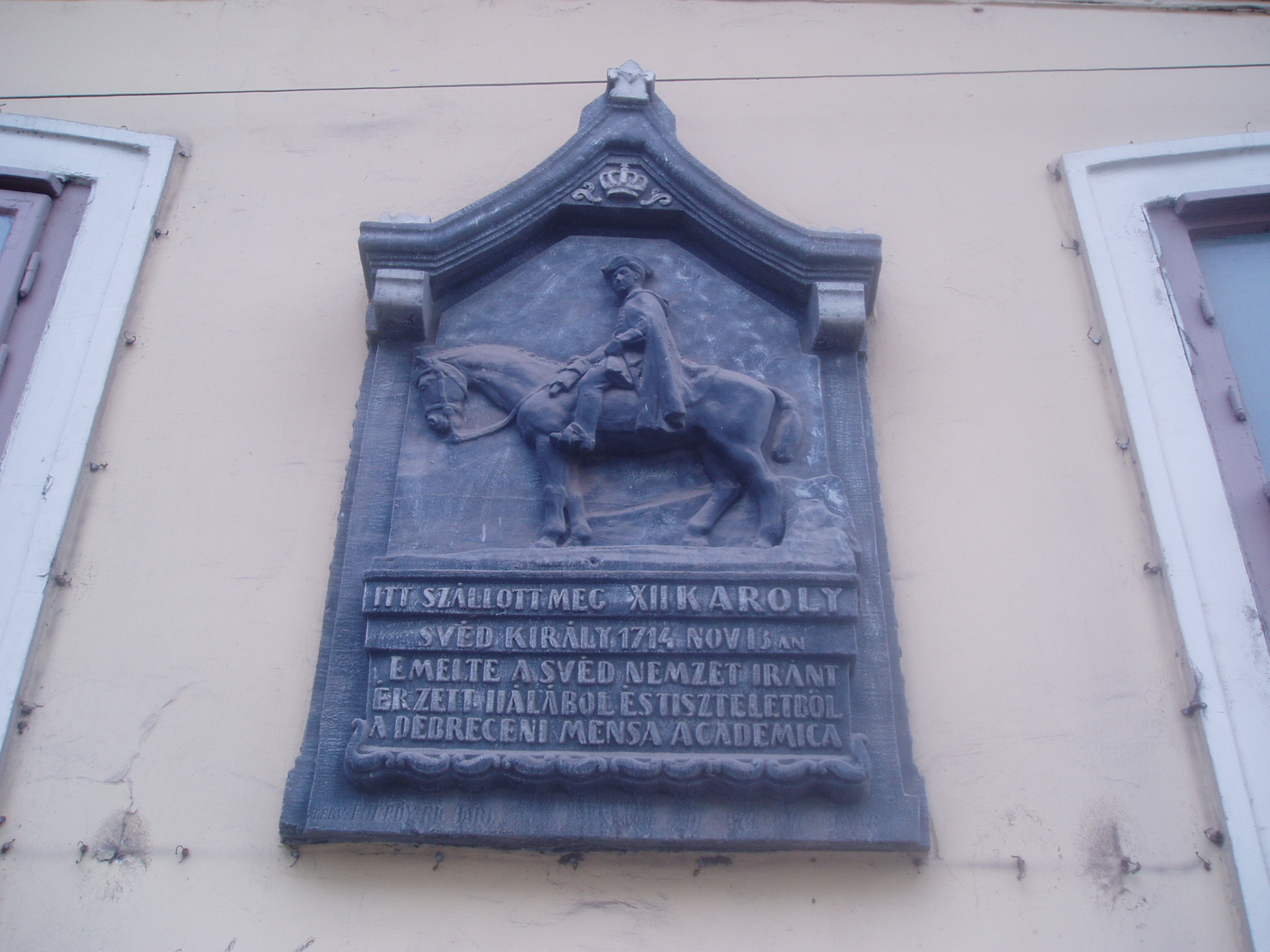 Nyilvános 1074 | 1540 | Debrecen, Széchenyi utca 6. | Debrecen legrégibb fennmaradt lakóháza az 1690-es években emelt patríciusház. A 17. század végén már Diószegi Sámuelé, a város főbírájáé, s első postamesteréé is volt. A ház így fogadóként is szolgált. Legnevezetesebb vendége XII. Károly svéd király volt, aki itt szállt meg 1714. november 16-án, amikor Törökországból hazafelé tartott az I. Péter orosz cártól elszenvedett vereség után. Az egykorú források megőrizték, hogy a király, aki nemcsak híres hadvezér és államférfi volt a maga korában, hanem felvilágosult gondolkodó is, igazi lelki gyönyörűséget talált a debreceni főbíró házánál, ahol a kollégium professzoraival, a nagy műveltségű, világot járt házigazdával és más olvasott férfiakkal találkozott. A továbbutazó király elégedetten jegyezte fel, hogy itt, a távoli magyar városban igen jól felszerelt és gazdag könyvtár állt rendelkezésére esti olvasás céljából. Felh. irod.: Papp Antal: Debrecen. Bp. Panoráma, 1976 www.debrecen.hu |