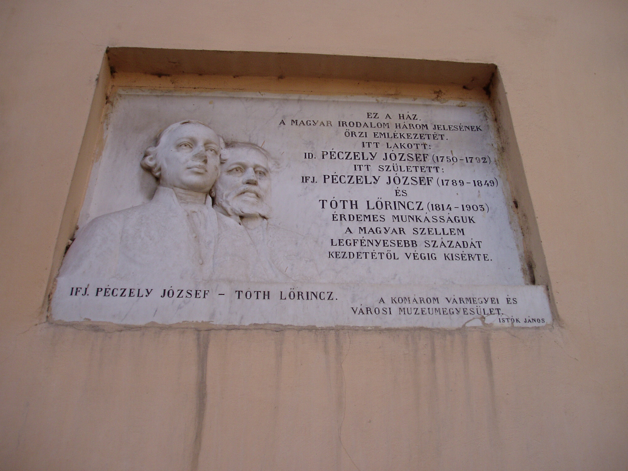 Nyilvános 1520 | 3736 | Komárom (Komárno), Ferences barátok u. 22. | Ez a ház volt a régi református lelkészlak. Itt lakott 1783-tól haláláig id. Péczeli József (1750-1792) költő, műfordító, aki 1789-ben megszervezte a Komáromi Tudós Társaságot, megalapította és szerkesztette az 1789 és 1792 között megjelenő első magyar tudományos-ismeretterjesztő folyóiratot, a Mindenes Gyűjteményt. Szintén ebben a házban lakott Mindszenthy Sámuel (1751-1806) író, lexikonkiadó, a Mindenes Gyűjtemény társszerkesztője. Ebben a házban született Péczely József fiaként ifj. Péczely József (1789-1849) tanár, történész, akadémikus, valamint Tóth János református lelkész fiaként Tóth Lőrinc (1814-1903) író, jogtudós, a Magyar Tudományos Akadémia tagja, ügyésze és pénztárosa. 1845-től a XX. század elejéig itt laktak a dunántúli református egyházkerületnek a tudományokban, az irodalomban és a közéletben is tevékeny püspökei: 1845-76 között Nagy Mihály (1788-1878) hittudós, több egyházi mű szerzője; 1878-1895-ben Pap Gábor (1827-1895) költő, országgyűlési képviselő, szenvedélyes könyv- és éremgyűjtő; 1895-től az 1900-as évek elejéig Antal Gábor, számos társadalmi, közgazdasági és bölcseleti értekezés szerzője. A ház homlokzatán a Komárom vármegyei és városi Muzeum-egyesület 1904-ben id. Péczeli Józsefre, ifj. Péczeli Józsefre és Tóth Lőrincre emlékeztető márványtáblát helyezett el, amelyet Istók János szobrászművész alkotott. A táblát 1945-ben eltávolították, s csak hosszú idő után, 1991-ben került vissza eredeti helyére. A fénykép 2005. júliusában készült. Felhasznált irodalom: Mácza Mihály: Komárom mevezetességei. Pozsony, Madách-Posonium, 2002 |