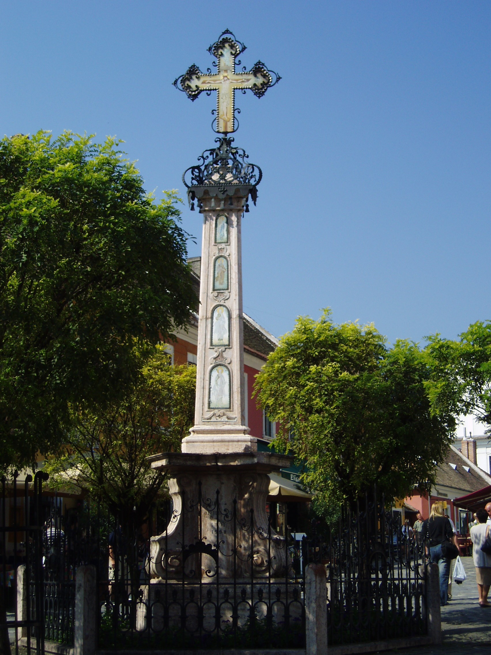 Nyilvános 1082 | 2091 | Szentendre, Fő tér: a Kereskedő Társaság emlékkeresztje | A keresztet az 1698-ban alakult szerb kereskedő társaság emeltette 1763-ban, nagy építkezései befejezésének évében, hálából, hogy a nagy pestisjárvány elkerülte a várost. A kereszt vörös mészkőből készült, gazdag rokokó faragványokkal, kovácsoltvas díszítésekkel és vaslemezre festett ikonok ékesítik. A néphagyomány azt tartja, hogy fejjel lefelé eltemetett ember van alatta, hogy a pestis elő ne tudjon bújni a föld alól. A fénykép 2005 szeptemberében készült. Szentendre. Szerk. Sándyné Wolf Katalin. Bp. Panoráma, 1985 www.szentendre.hu |
