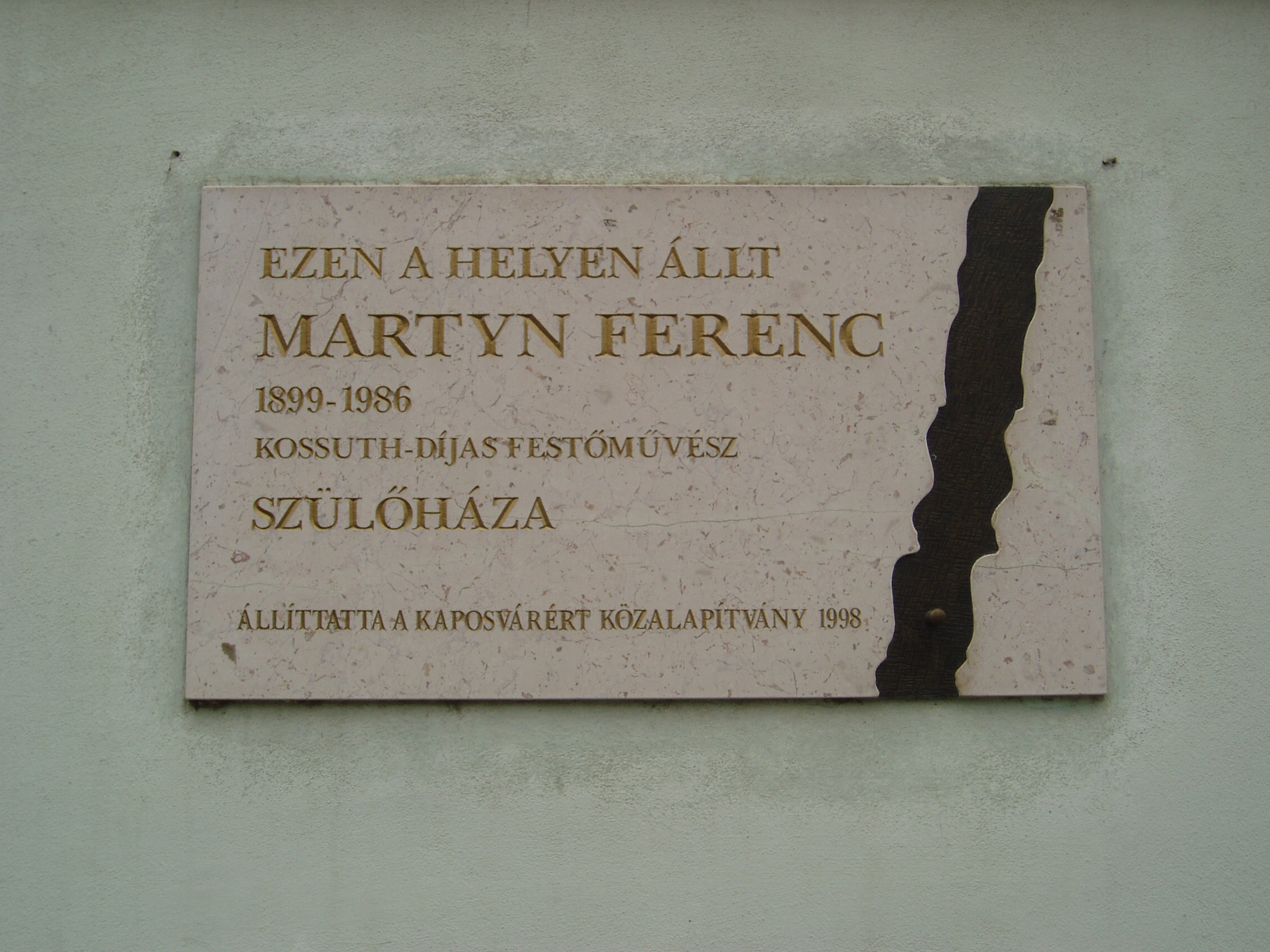 Nyilvános 1077 | 1822 | Kaposvár, Fő utca 70. | A mostani épület helyén egykor állott házban született 1899. június 10-én Martyn Ferenc (1899-1986) festőművész. Emléktábláját 1998-ban avatták fel. Rokona volt Rippl-Rónai Józsefnek, unokája Piacsek bácsinak, Rippl-Rónai egyik kedvelt modelljének. Édesnyja halála után gyermekkorát - fivérével, a legendás orvossá lett Martyn Róbert Alajossal együtt - Rippl-Rónai házában (lásd: Kaposvár, Róma-villa) töltötte. A fénykép 2006 márciusában készült. Felh. irod.: Martyn Ferenc: Visszaemlékezések Rippl-Rónai Józsefre. = Somogyi Almanach 3. Szerk. Kanyar József. Kaposvár, 1958 |