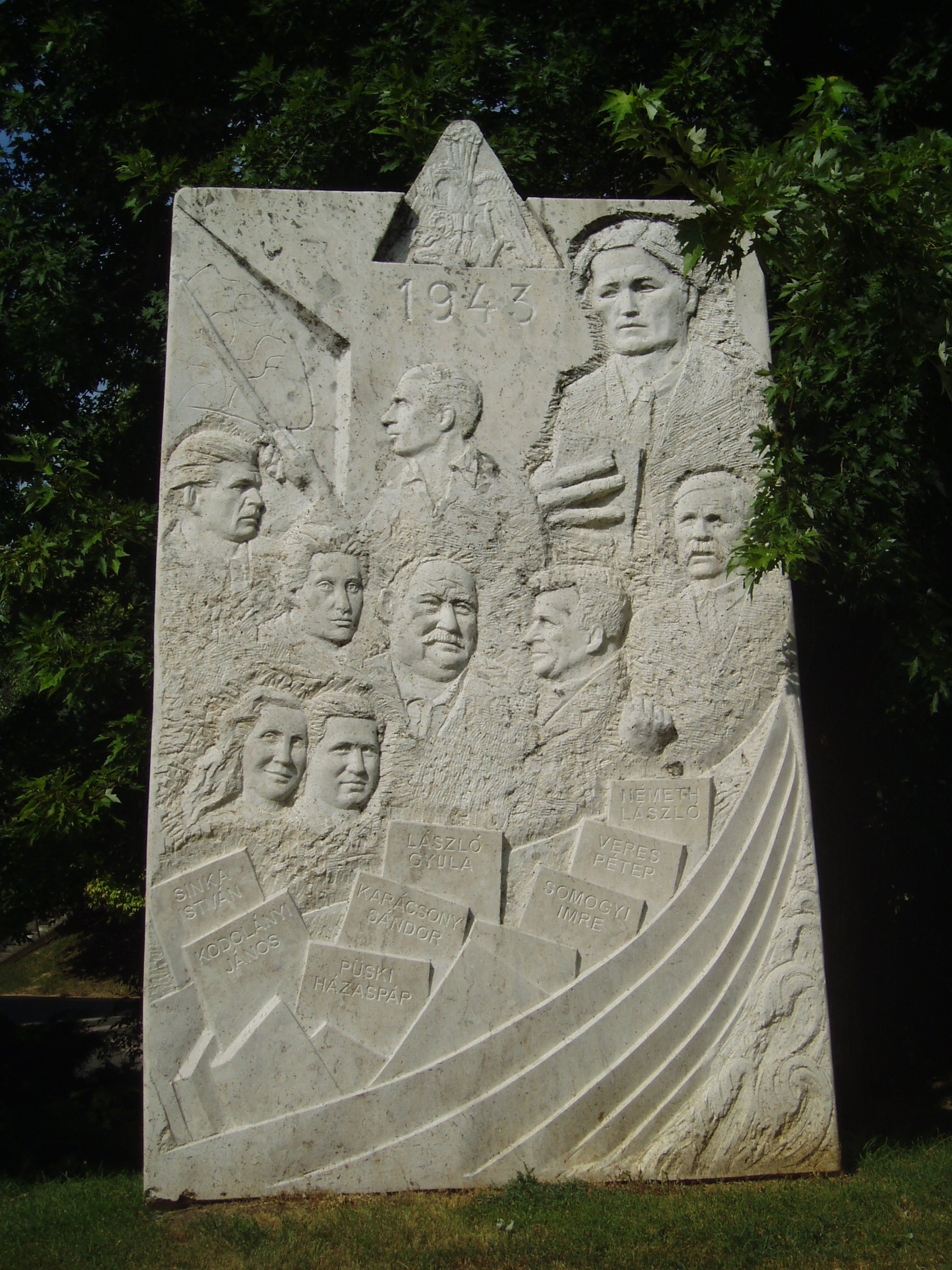 Nyilvános 1533 | 3800 | Balatonszárszó, Hősök tere: az 1943-as írótalálkozó emlékműve | 1943. augusztus 20-23. között Püski Sándor, a Magyar Élet Könyvkiadó tulajdonosa és a Soli Deo Gloria Szövetség közös rendezésében jött létre a legendás, azóta jelképpé vált szárszói konferencia. A rendezvényen, amelynek fő témája a magyarság háború utáni életének lehetősége volt, mintegy hatszázan vettek részt. Az emlékművet a Szárszó Baráti Kör és a Püski Kiadó kezdeményezésére állították 2000. augusztusában. Mint az avatóünnepség szónokai elmondották, a szárszói konferencia a független demokratikus Magyarország, az összefogás és a megújulás történelmi jelképe. Diénes Attila szobrászmuvész 10 tonnás kőoszlopban faragta meg az 1943-as szárszói konferencia legendás alakjait: Sinka Istvánt, Kodolányi Jánost, a Püski-házaspárt, Karácsony Sándort, László Gyulát, Somogyi Imrét és Németh Lászlót. A fénykép 2007 júniusában készült. Felh. irod.: Emlékmű a megújulás jelképének. = www.balatonpress.com |