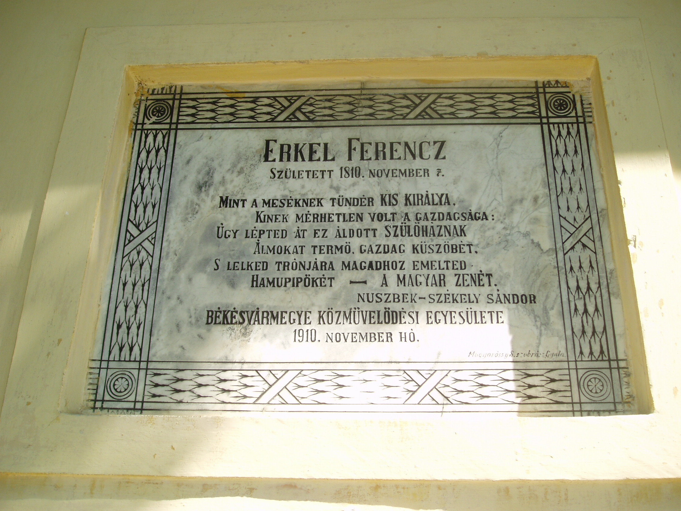 Nyilvános 1360 | 2921 | Gyula, Apor tér 7. Erkel Ferenc szülőháza | A földszintes, klasszicista jellegű németgyulai iskola és kántortanítói lakás 1795-ben épült. Az L alakú épület Apor térre néző szárnya volt az iskola, a Dürer utcára néző pedig a tanítói lakás, melynek ablakai közül kettő a térre néz. Ebben a házban született 1810. november 7-én Erkel Ferenc a németgyulai tanító fiaként, s testvéreivel együtt itt nevelkedett szeretetteljes családi légkörben. Első zenei tanítója remekül muzsikáló édesapja volt. Már néhány héttel Erkel halála után, 1893. július 5-én a házat emléktáblával jelölték meg, amelyet 1910-ben, születésének centenáriumán a képen is látható díszesebbre cserélték. A korábbi tantermek helyén először 1960-ban rendeztek kiállítást, majd 1970-ben nyílt meg az Erkel Ferenc Emlékmúzeum. 1985-ben kibővítették, múzeumnak rendezték be az eredeti tanítói lakás helyiségeit is, köztük azt a sarokszobát, amelyben Erkel született. Az Emlékház gyűjteményében megtekinthetőek az Erkel család relikviái, s itteni életkörülményeikbe is bepillanthat a látogató. A fénykép 2007 júliusában készült. Felh. irod.: Czeglédi Imre: Gyula útikalauz. 2. bőv. kiad. Gyula, 1995 Czeglédi Imre: Erkel Ferenc Emlékház /Tájak, korok, múzeumok 238./ Németh Csaba: A gyulai Erkel Ferenc Múzeum Erkel–gyűjteménye. Gyula, 2007. /Gyulai katalógusok 12./ |