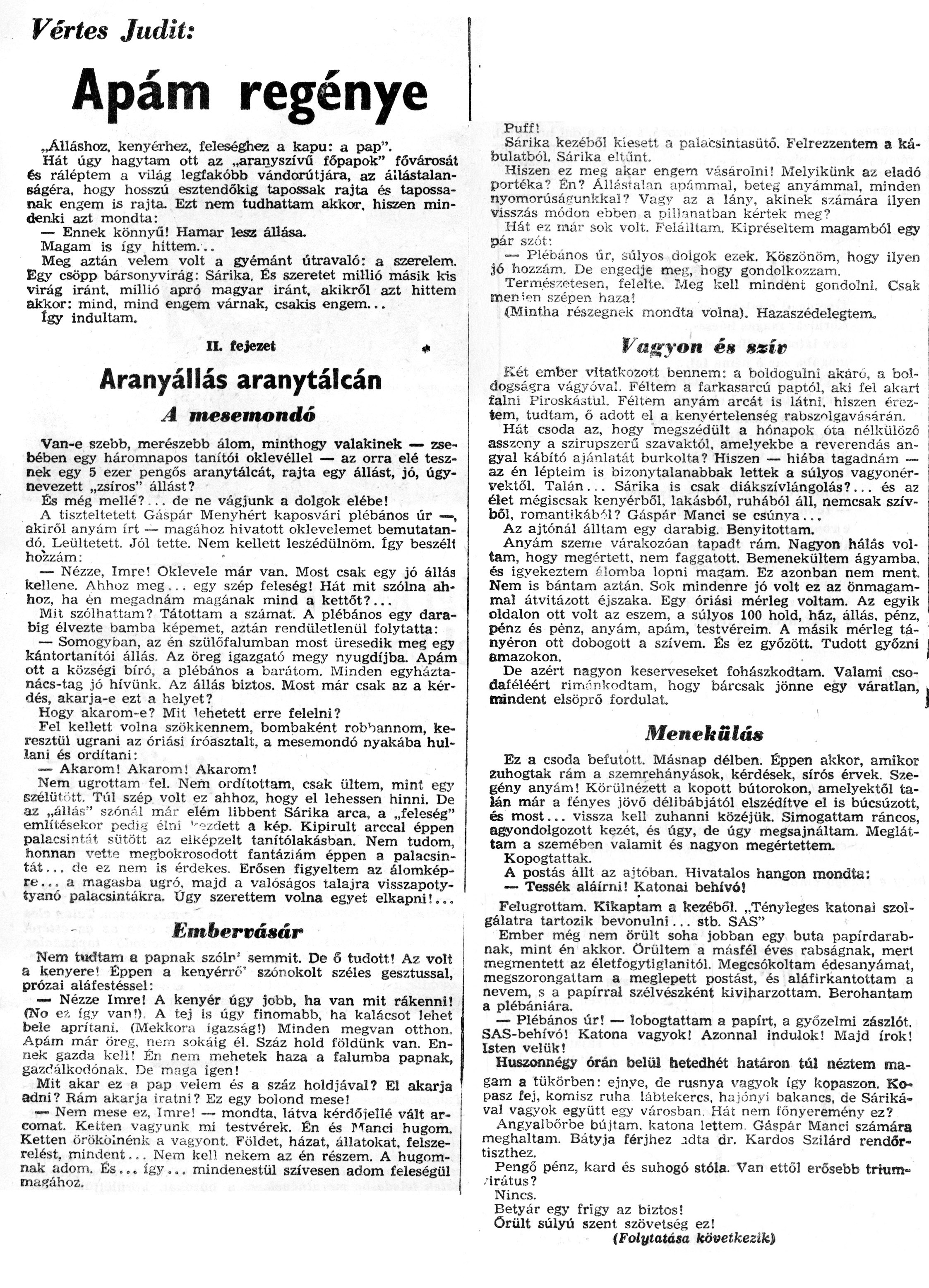 Nyilvános 1141 | 2190 | Zalai Hírlap 1971.01.10. 008sz 08old - Apám regénye 02 | A következő szöveg a cikkből keletkezett automata szövegfelismertető segítségével: Vértes Judit: Apám regénye „Álláshoz, kenyérhez, feleséghez a kapu: a pap". Hát úgy hagytam ott az „aranyszívű főpapok" fővárosát és ráléptem a világ legfakóbb vándorútjára, az állástalanságéra, hogy hosszú esztendőkig tapossak rajta és tapossanak engem is rajta. Ezt nem tudhattam akkor, hiszen mindenki azt mondta: — Ennek könnyű! Hamar lesz állása. Magam is így hittem... Meg aztán velem volt a gyémánt útravaló: a szerelem. Egy csöpp bársonyvirág: Sárika. És szeretet millió másik kis virág iránt, millió apró magyar iránt, akikről azt hittem akkor: mind, mind engem várnak, csakis engem... Így indultam. n. fejezet # Aranyállás aranytálcán T A mesemondó Van-e szebb, merészebb álom, minthogy valakinek — zsebében egy háromnapos tanítói oklevéllel — az orra elé tesznek egy 5 ezer pengős aranytálcát, rajta egy állást, jó, úgynevezett „zsíros" állást? És még mellé?-., de ne vágjunk a dolgok elébe! A tiszteltetett Gáspár Menyhért kaposvári plébános úr —, akiről anyám írt — magához hivatott oklevelemet bemutatan-dó; Leültetett. Jól tette. Nem kellett leszédülnöm. így beszélt hozzám: — Nézze, Imre! Oklevele már van. Most csak egy jó állás kellene. Ahhoz meg... egy szép feleség! Hát mit szólna ahhoz, ha én megadnám magának mind a kettőt?... Mit szólhattam? Tátottam a számat. A plébános egy darabig élvezte bamba képemet, aztán rendületlenül folytatta: — Somogyban, az én szülőfalumban most üresedik meg egy kántortanítói állás. Az öreg igazgató megy nyugdíjba. Apám ott a községi bíró, a plébános a barátom. Minden egyháztanács-tag jó hívünk. Az állás biztos. Most már csak az a kérdés, akarja-e ezt a helyet? Hogy akarom-e? Mit \'ehetett erre felelni? Fel kellett volna szökkennem, bombaként robbannom, keresztül ugrani az óriási íróasztalt, a mesemondó nyakába hullani és ordítani: ■— Akarom! Akarom! Akarom! Nem ugrottam fel. Nem ordítottam, csak ültem, mint egy szélüt\'tt. Túl szép volt ez ahhoz, hogy el lehessen hinni. De az „állás" szómU már elém libbent Sárika arca, a „feleség" említésekor pedu» élni \'-°zdett a kép. Kipirult arccal éppen palacsintát sütött az elképzelt tanítólakásban. Nem tudom, honnan \\retto megbokrosodott fantáziám éppen a palacsintát ... da ez nem is érdekes. Erősen figyeltem az álomképre... a magasba ugró, majd a valóságos talajra visszapoty-tyanó palacsintákra. Ügy szerettem volna egyet elkapni!... Embervásár Nem tudtam a papnak szóin\' semmit. De 6 tudott! Az volt a kenyere\' Éppen a kenyérré\' szónokolt széles gesztussal, prózai aláfestéssel: — Nézze Imre! A kenyér úgy jobb, ha van mit rákenni! (No ez így van!), A tej is úgy finomabb, ha kalácsot lehet bele aprítani. (Mekkora igazság!) Minden megvan otthon. Apám már öreg, nem sokáig él. Száz hold földünk van. Ennek gazda kell! Én nem mehetek haza a falumba papnak, gazdálkodónak. De maga igen! Mit akar ez a pap velem és a száz holdjával? El akarja adni? Rám akarja íratni? Ez egy bolond mese! — Nem mese ez, Imre! — mondta, látva kérdőjellé vált arcomat. Kelten vagyunk mi testvérek. Én és Manci húgom. Ketten örökölnénk a vagyont. Földet, házat, állatokat, felszerelést, mindent... Nem kel! nekem az én részem. A húgomnak adom. És ... így... mindenestül szívesen adom feleségül niaf?ához. Puff! Sárika kezéből kiesett a palacsintasütő. Felrezzentem a ká-foulatból. Sárika eltűnt. Hiszen ez meg akar engem vásárolni! Melyikünk az eladó portéka? Én? Állástalan apámmal, beteg anyámmal, minden nyomorúsáfrunkkal ? Vagy az a lány, akinek számára ilyen visszás módon ebben a pillanatban kértek meg? Hát ez már sok volt. Felálltam. Kipréseltem magamból egy pár szót: — Plébános űr, súlyos dolgok ezek. Köszönöm, hogy ilyen jő hozzám. De engedje meg, hogy gondolkozzam. Természetesen, felelte. Meg kell mindent gondolni. Csak menien szépen haza! {Mintha részegnek mondta volna). Hazaszédelegtera, Vagyon és ssív : \'■ \' Két ember vitatkozott bennem: a boldogulni akáro, a boldogságra vágyóvá\'.. Féltem a farkasarcú paptól, aki fel akart falni Piroskástul. Féltem anyám arcát is látni, hiszen éreztem, tudtam, ő adott el a kenyértelenség rabszolgavásárán. Hát csoda az, hogy megszédült a hónapok óta nélkülöző asszony a szirupszerű szavaktól, amelyekbe a reverendás angyal kábító ajánlatát burkolta? Hiszen — hiába tagadnám — az én lépteim is bizonytalanabbak lettek a súlyos vagyonér-vektől. Talán.,. Sárika is csak diákszívlángolás?... és az élet mégiscsak kenyérből, lakásból, ruhából áll, nemcsak szívből, romantikából? Gáspár Manci se csúnva ... Az ajtónál álltam egy darabig. Benyitottam. Anyám szeme várakozóan tapadt rám. Nagyon hálás voltam, hogy megértett, nem faggatott. Bemenekültem ágyamba. és igyekeztem f Somba lopni masam. Ez azonban nem ment. Nem is bántam aztán. Sok mindenre jó volt ez az önmagámmal átvitázott éjszaka. Egy óriási mérleg voltam. Az egyik oldalon ott volt az eszem, a súlyos 100 hold, ház, állás, pénz, pénz és pénz, anyám, apám, testvéreim. A másik mérleg tányéron ott dobogott a szívem. És ez győzött. Tudott győzni amazokon. De azért nagyon keserveseket fohászkodtam. Valami csodaféléért rimőnkodtam, hogy bárcsak jönne egy váratlan, mindent elsöprő fordulat. i Menekülő* Ez a csoda befutott. Másnap délben. Éppen akkor, amikor zuhogtak rám a szemrehányások, kérdések, sírós érvek. Szegény anyám! Körülnézett a kopott bútorokon, amelyektől talán már a fényes jövő délib