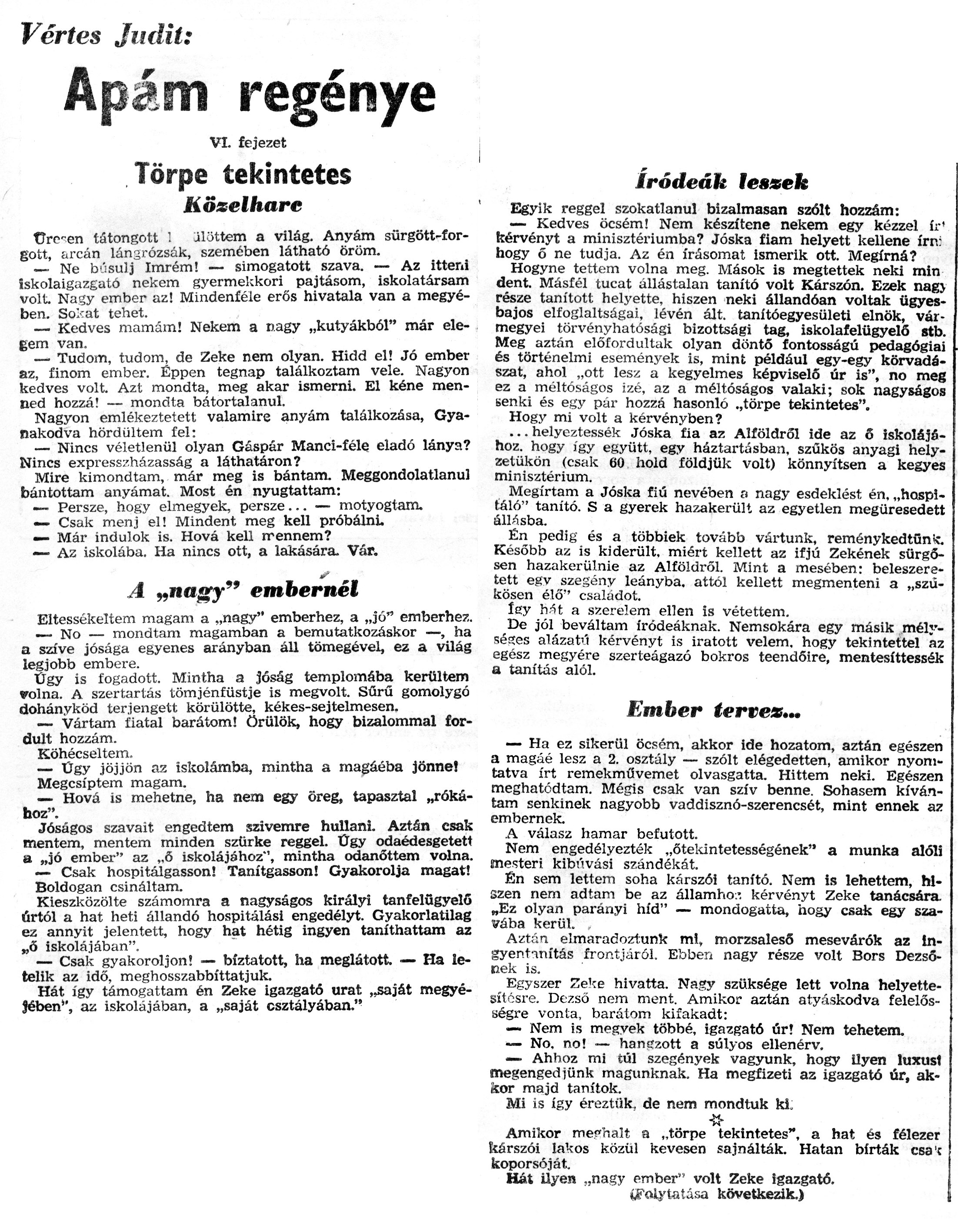 Nyilvános 1085 | 2123 | Zalai Hírlap 1971.01.24. 020sz 08old - Apám regénye 04 | A következő szöveg a cikkből keletkezett automata szövegfelismertető segítségével: Vértes Judit: Apám regénye VI. fejezet Törpe tekintetes {■ Közelharc ürc-en tátongott ! jlöttem a világ. Anyám sürgött-for-gott, arcán lángrózsák, szemében látható öröm. — Ne búsulj Imrém! — simogatott szava. — Az itteni iskolaigazgató nekem gyermekkori pajtásom, iskolatársam volt Nagy ember az! Mindenféle erős hivatala van a megyében. So\'^at tehet. ..... __ Kedves mamám! Nekem a nagy „kutyákból" mar elegem van. __Tudom, tudom, de Zeke nem olyan. Hidd el! Jó ember az, finom ember. Éppen tegnap találkoztam vele. Nagyon kedves volt. Azt mondta, meg akar ismerni. El kéne menned hozzá! — mondta bátortalanul. Nagyon emlékeztetett valamire anyám találkozása, Gyanakodva hördültem fel: — Nincs véletlenül olyan Gáspár Manci-féle eladó lánya? Nincs expresszházasság a láthatáron? Mire kimondtam, már meg is bántam. Meggondolatlanul bántottam anyámat. Most én nyugtattam: __ Persze, hogy elmegyek, persze... — motyogtam. — Csak menj el! Mindent meg kell próbálni. — Már indulok is. Hová kell rrennem? — Az iskolába. Ha nincs ott, a lakására. Vár. __ \' A „nagy" embernél Eltessékeltem magam a „nagy" emberhez, a „jó" emberhez. __ No — mondtam magamban a bemutatkozáskor —, ha a szíve jósága egyenes arányban áll tömegével, ez a világ legjobb embere. | Ügy is fogadott. Mintha a jóság templomába kerültem volna. A szertartás tömjénfüstje is megvolt. Sűrű gomolygó dohányköd terjengett körülötte, kékes-sejtelmesen. — Vártam fiatal barátom! örülök, hogy bizalommal fordult hozzám. Köhécseltem. — Ügy jöjjön az iskolámba, mintha a magáéba jönne! Megcsíptem magam. — Hová is mehetne, ha nem egy öreg, tapasztal „rókához". Jóságos szavait engedtem szivemre hullani. Aztán csak mentem, mentem minden szürke reggel. Ügy odaédesgetett a „jó ember" az „6 iskolájához", mintha odanőttem volna. — Csak hospitálgasson! Tanítgasson! Gyakorolja magát! Boldogan csináltam. Kieszközölte számomra a nagyságos királyi tanfelügyelő úrtól a hat heti állandó hospitálási engedélyt. Gyakorlatilag ez annyit jelentett, hogy hat hétig ingyen taníthattam az „ő iskolájában". — Csak gyakoroljon! — bíztatott, ha meglátott. — Ha letelik az idő, meghosszabbíttatjuk. Hát így támogattam én Zeke igazgató urat „saját megyéjében", az iskolájában, a „saját osztályában." íródeák lessek Egyik reggel szokatlanul bizalmasan szólt hozzám: — Kedves öcsém! Nem készítene nekem egy kézzel ír\' kérvényt a minisztériumba? Jóska fiam helyett kellene írn: hogy ő ne tudja. Az én írásomat ismerik ott. Megírná? Hogyne tettem volna meg. Mások is megtettek neki min dent. Másfél tucat állástalan tanító volt Kárszón. Ezek nag> része tanított helyette, hiszen neki állandóan voltak ügyesbajos elfoglaltságai, lévén ált. tanítóegyesületi elnök, vármegyei törvényhatósági bizottsági tag, iskolafelügyelő stb. Meg aztán előfordultak olyan döntő fontosságú pedagógiai és történelmi események is, mint például egy-egy körvadászat, ahol „ott lesz a kegyelmes képviselő úr is", no meg ez a méltóságos izé, az a méltóságos valaki; sok nagyságos senki és egy pár hozzá hasonló ..törpe tekintetes". Hogy mi volt a kérvényben? ... helyeztessék Jóska fia az Alföldről ide az ő iskolájához, hogy így együtt, egy háztartásban, szűkös anyagi helyzetükön (csak 60 hold földjük volt) könnyítsen a kegyes minisztérium. Megírtam a Jóska fiú nevében a nagy esdeklést én. „hospl-táló" tanító. S a gyerek hazakerült az egyetlen megüresedett állásba. Én pedig és a többiek tovább vártunk, reménykedtünk Később az is kiderült, miért kellett az ifjú Zekének sürgősen hazakerülnie az Alföldről. Mint a mesében: beleszeretett egv szegény leányba, attól kellett megmenteni a „szűkösen élő" csaladot. íey h.-ít a szerelem ellen is vétettem. De jól beváltam íródeáknak. Nemsokára egy másik mélységes alázat\'í kérvényt is íratott velem, hogy tekintettel az egész megyére szerteágazó bokros teendőire, mentesíttessék a tanítás alól. Ember tertex... — Ha ez sikerül öcsém, akkor ide hozatom, aztán egészen a magáé lesz a 2. osztály — szólt elégedetten, amikor nyomtatva írt remekművemet olvasgatta. Hittem neki. Egészen meghatódtam. Mégis csak van szív benne. Sohasem kívántam senkinek nagyobb vaddisznó-szerencsét, mint ennek az embernek. A válasz hamar befutott. Nem engedélyezték „őtekintetességének" a munka alóli mesteri kibúvási szándékát. Én sem lettem soha kárszói tanító. Nem is lehettem, hiszen nem adtam be az államho:\'. kérvényt Zeke tanácsára. „Ez olyan parányi híd" — mondogatta, hogy csak egy szavába kerül. Aztán elmaradoztunk ml, morzsaleső mesevárók az in-gyentnnítás frontjáról. Ebben nagy része volt Bors Dezsőnek is. Egyszer "eke hivatta. Nagy szüksége lett volna helyettesítésre. Dezső nem ment. Amikor aztán atyáskodva felelősségre vonta, barátom kifakadt: — Nem is megyek többé, igazgató úr! Nem tehetem. — No. no! — hangzott a súlyos ellenérv. •— Ahhoz mi túl szegények vagyunk, hogy ilyen luxust megengedjünk magunknak. Ha megfizeti az igazgató úr, ak-ísor majd tanítok. Mi is így éreztük, de nem mondtuk ki: Amikor me«"nalt a „törpe tekintetes", a hat és félezer kárszói lakos közül kevesen sajnálták. Hatan bírták csa\'c koporsóját. Hát ilyen „nagy ember" volt Zeke igazgató. (Folytatása következik.) |