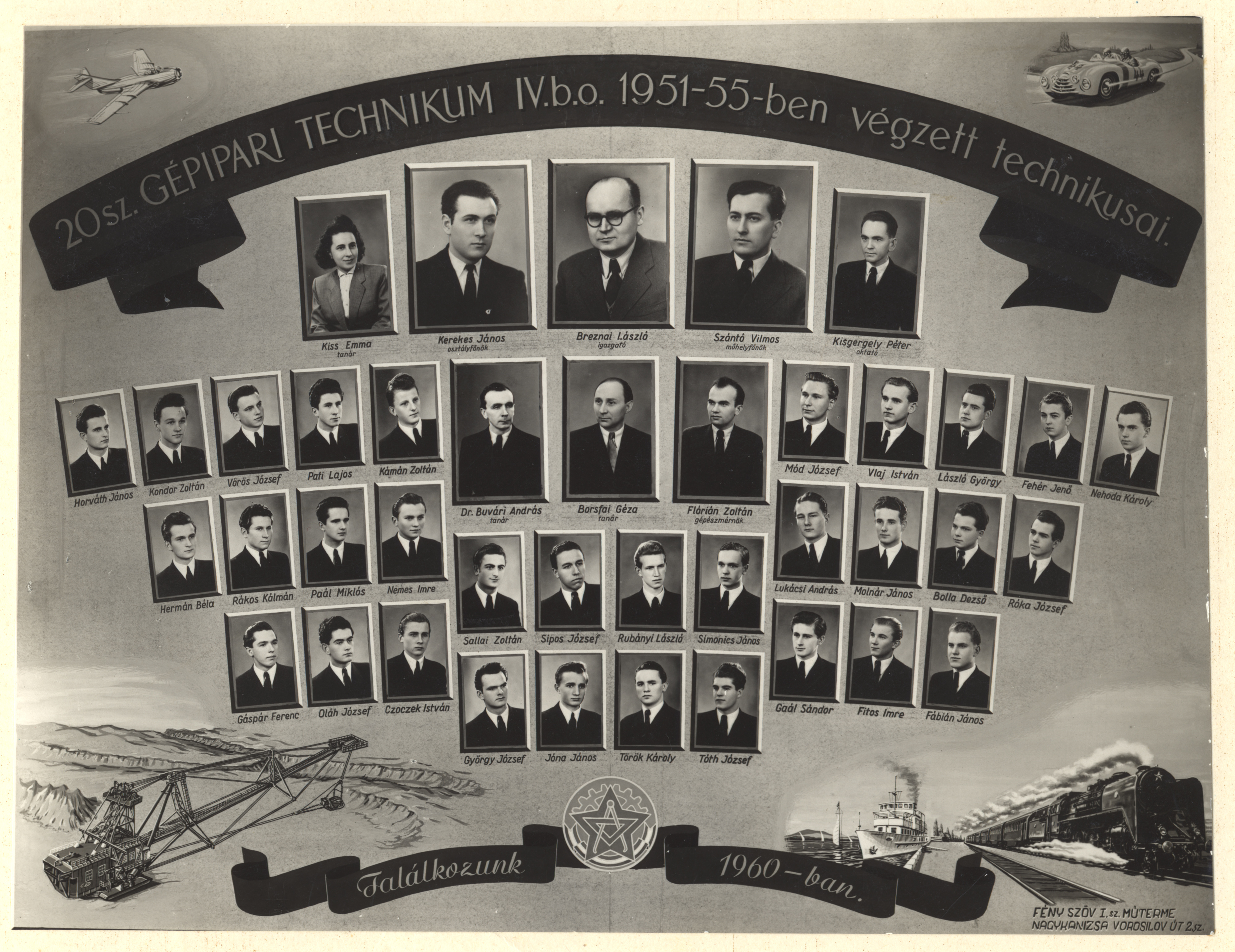 Nyilvános 1307 | 2367 | 20 sz. Gépipari Technikum IV.b.o. 1951-55-ben végzett technikusai | Borsfai Géza tanár Breznai László igazgató Buvári András dr. tanár Flórián Zoltán gépészmérnök Kerekes János osztályfőnök Kisgergely Péter oktató Kiss Emma tanár Szántó Vilmos műhelyfőnök Bolla Dezső Czoczek István Fábián János Fehér Jenő Fitos Imre Gaál Sándor Gáspár Ferenc György József Hermán Béla Horváth János Jóna János Kámán Zoltán Kondor Zoltán László György Lukácsi András Mód József Molnár János Nehoda Károly Nemes Imre Oláh József Paál Miklós Pati Lajos Rákos Kálmán Róka József Rubányi László Sallai Zoltán Simonics János Sipos József Tóth József Török Károly Vlaj István Vörös József |