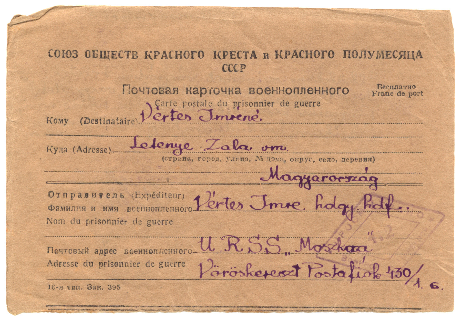 Nyilvános 1238 | 2329 | Vértes Imréné | Letenye Zala vm. Magyarország Vértes Imre hdgy. hdf. C.C.C.P. "Moszkva" Vöröskereszt, Postafiók 430/1. c. 1946. november 1. Elküldöm szívemet vágyódva Felétek. Kérdezem, kutatom: "Haltok-e, vagy éltek?" Vágyaim keresztjét könnyebben hordoznám, Sárikám, ha tudnám, hogy élsz és gondolsz rám. Imre |